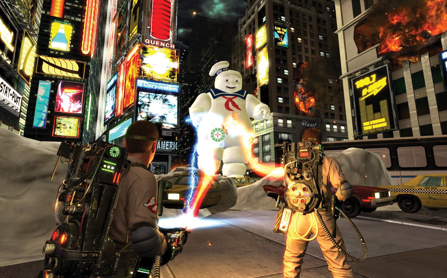 Nachdem wir (mal wieder) den großen Ballsaal verwüsten und Slimer in Sicherheitsverwahrung stecken, geht das ganze Spektakel richtig los. Wir möchten an dieser Stelle aber nicht zu viel verraten, da besonders die ersten drei Levels sich sehr stark an den beiden Kinofilmen orientieren. Danach nimmt der Kultfaktor allerdings ab. Die Handlung wirkt aufgesetzt und kann eigentlich nur noch durch die flotten Sprüche der Geisterjäger motivieren, da fast keine bekannten Ungetüme mehr auftauchen. Die neuen Gegner erreichen unserer Meinung nach nicht annähernd den Charme, welche die Geisterwelt in den Filmen verkörpert hat. Dafür müssen sie aber oft auf unterschiedliche Art und Weise gefangen oder besiegt werden. Mit dem Stasisstrahl frieren wir die Geister ein und können sie anschließend mit dem normalen Protonenstrahl besiegen. Außerdem dürfen wir mit dem Schleimwerfer positiv geladenen Schleim auf die monströsen Gestalten feuern, sofern sie mit schwarzem Schleim behaftet sein sollten. Anderenfalls hätten wir kaum eine Chance, sie zu besiegen.