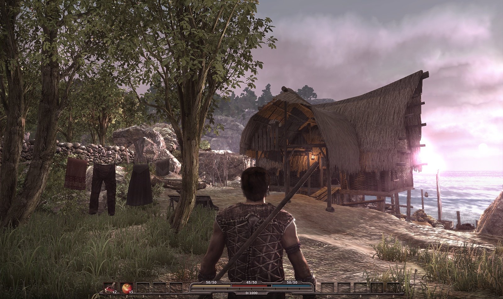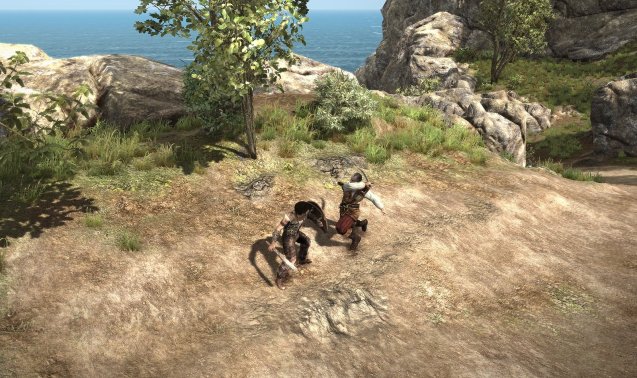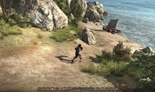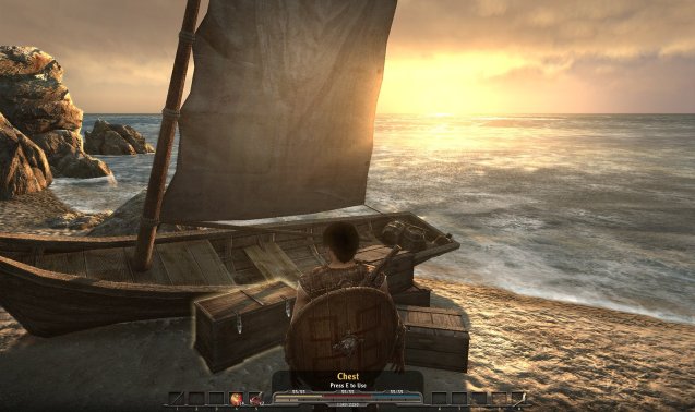 Anstatt den aus den ersten Serienteilen bekannten, namenlosen Helden zu verkörpern, stecken wir in Arcania: Gothic 4 in der Haut eines gänzlich neuen Charakters. Dieser kommt wie sein Vorgänger ebenfalls ohne Namen daher. In der Rolle eines Schafhirten werden wir zu Beginn des Spiels von unserer Freundin Ivy aufgesucht. Ihr Vater möchte, dass wir in das nah gelegene Dorf eilen und ihm einen Besuch abstatten. So und nicht anders verzeichnen wir unseren ersten Auftrag im übersichtlichen Quest-Tagebuch. Bevor wir uns auf den Weg machen, möchten wir die spärlich, aber hübsch ausfallende Umgebung erkunden. Wir plündern ein paar Truhen, sacken mehrere Goldstücke ein und erweitern unser Inventar mit Heiltränken und anderen mehr oder weniger nützlichen Gegenständen. Das auf der malerischen Insel Feshyr gelegene Dorf können wir aufgrund des recht kleinen Spielabschnitts nicht verfehlen und erreichen es, wenn wir dem gradlinigen Weg entlang der Küste folgen. In der Siedlung angekommen, bemerken wir auch die wenigen Dorfbewohner, welche ihren Tagesabläufen nachgehen. Der Dorfschmied hämmert auf den Amboss, ein Fischer angelt am Strand nach Fischen und eine Bäuerin bestellt das Feld. Am Horizont ist ein Schiff zu erkennen, dessen Herkunft wir während unserer Spielzeit allerdings nicht lüften können. Der Kahn interessiert uns zum jetzigen Zeitpunkt auch nicht, da wir immer noch Ivys Vater Gromar aufsuchen müssen.