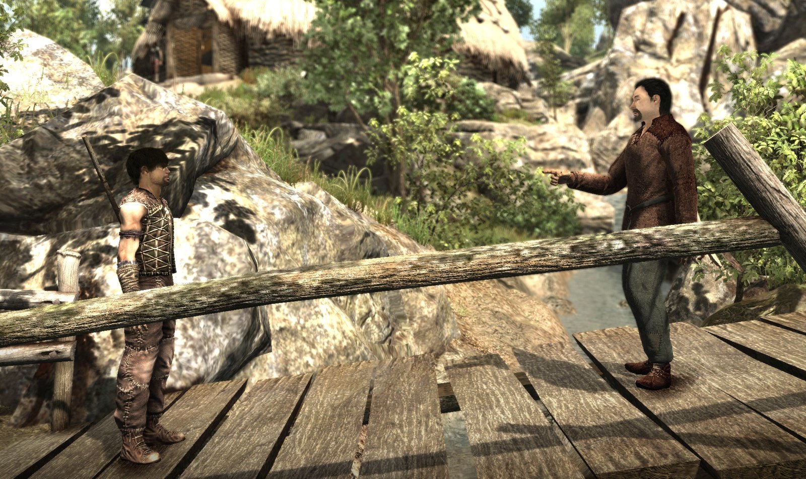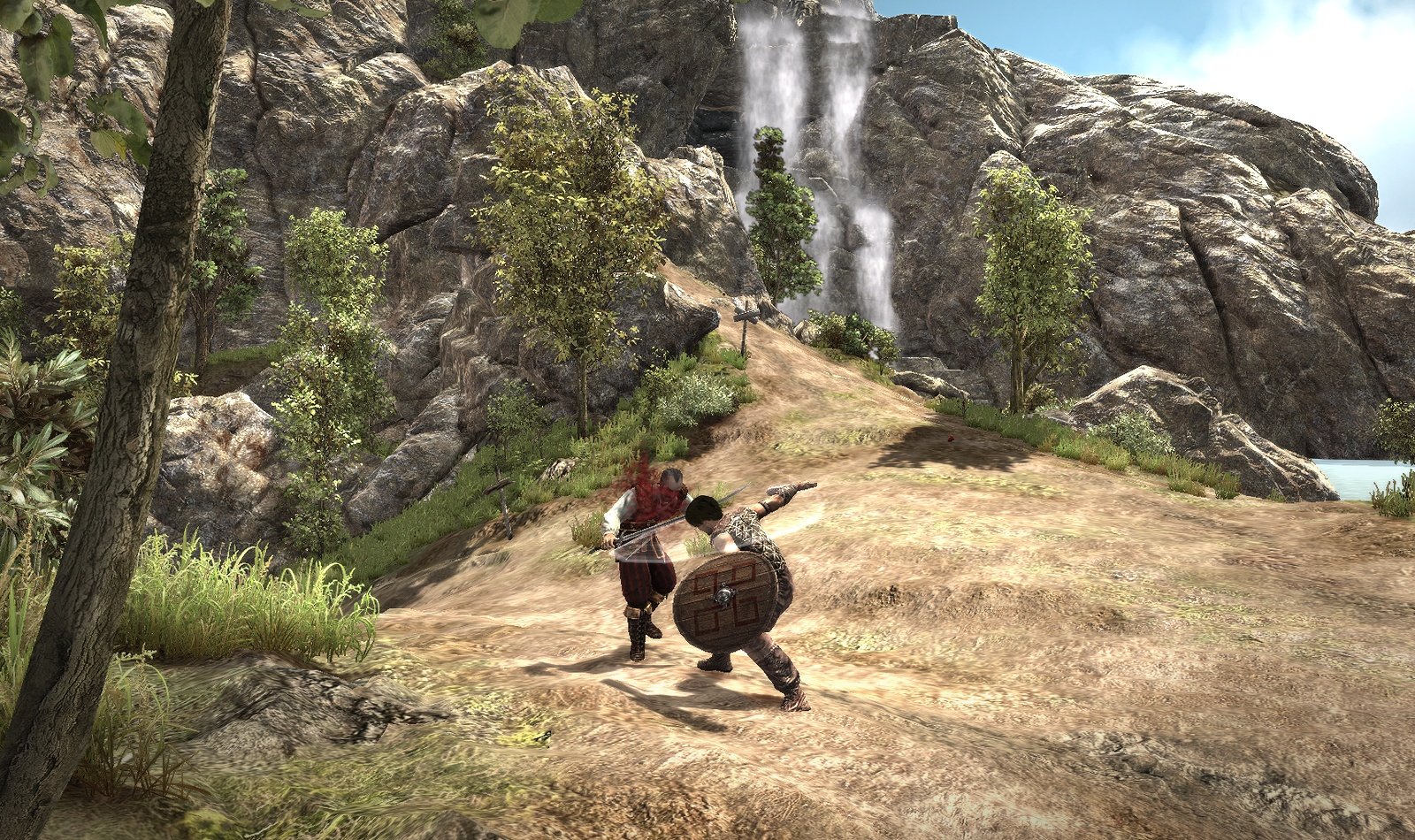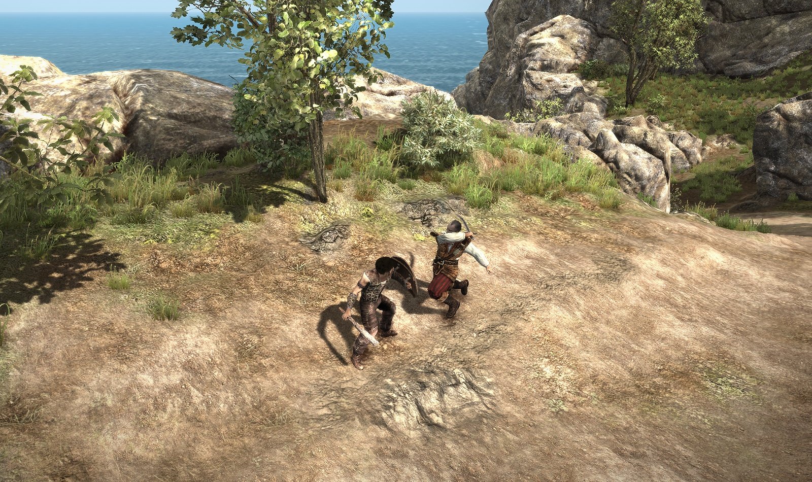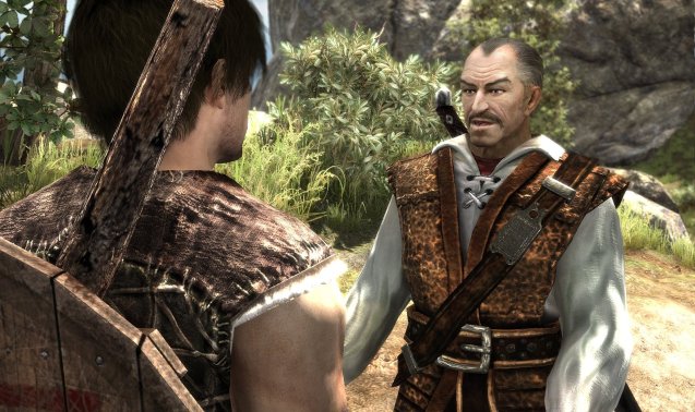 Dieser ruht sich unterdessen auf einer Bank in der Dorfmitte auf. Als er uns erblickt, ist er erbost darüber, dass wir wohl zu viel Zeit mit seiner Tochter verbringen. Unser Held erklärt ihm, dass er sie heiraten möchte, was den schroffen Herrn nur noch mehr aufregt. Dennoch behält er die Beherrschung und gibt uns prompt den Auftrag, einen Schmuggler außerhalb des Dorfes ausfindig zu machen und von der Insel zu vertreiben. Da wir unserer Herzensdame ein ganzes Stück näher kommen möchten, werden wir ihm den Gefallen tun. Ansonsten würde das Spiel auch ein jähes Ende finden, da wir den Gesprächsverlauf nur minimal verändern können. Er überreicht uns einen Schlüssel, mit welchem wir eines der verschlossenen Tore oberhalb des Dorfes öffnen können. Wir erklimmen den Berghang und treffen prompt auf besagten Schmuggler. Da wir die Vorgänger allesamt durchgespielt haben, erkennen wir das Gesicht des Mannes sofort. Bei dem Schmuggler handelt es sich um Diego, einen guten Freund des Helden aus dem Vorgänger. Auch unser namenloser Held hat sich bereits mit Diego angefreundet, wie wir im Verlauf des Gesprächs erfahren. Diego möchte unsere Fähigkeiten testen und fordert uns zum Kampf heraus, welchen wir mit Leichtigkeit gewinnen.