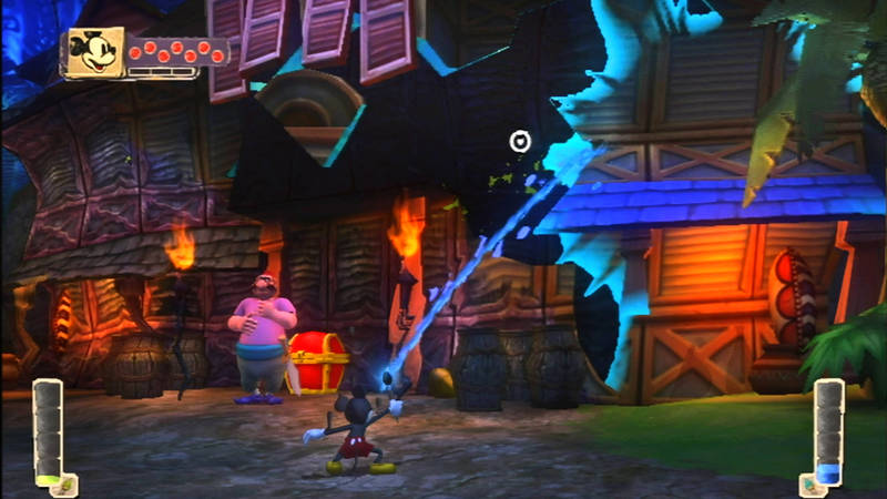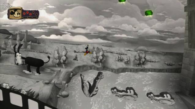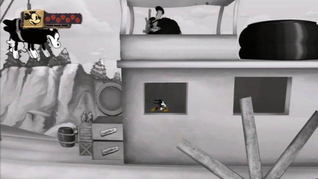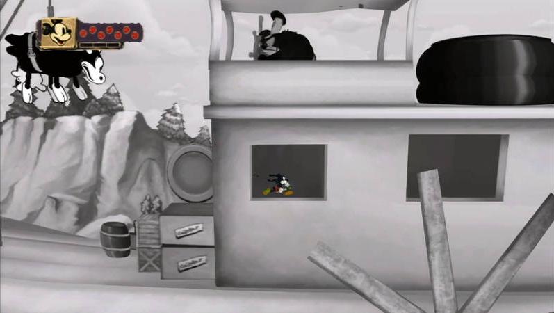 Unsere Reise führt uns dabei immer tiefer in das so genannte Wasteland hinein, das Micky Maus mit der Verdünnerflüssigkeit verwüstet hat. Das Wasteland wird im Übrigen von einem alten Bekannten beherrscht, nämlich von Oswald dem glücklichen Kaninchen. Doch kaum jemand erinnert sich an diese Comicfigur aus dem Hause Disney, selbst der Mäuserich hat ihn aus dem Gedächtnis gestrichen. Wir erinnern uns: Bevor Micky Maus das Licht der bunten Comicwelt erblickte, erschuf Walt Disney das Kaninchen Oswald. Irgendwann geschah es, dass Micky Maus dem Kaninchen den Rang abgelaufen hat. Wir können uns also sehr gut vorstellen, dass Oswald nicht gerade rosig auf Micky zu sprechen ist. Doch bis wir erstmals mit dem Herrscher des Wastelands richtig konfrontiert werden, vergehen einige Spielstunden. Oswald ist allerdings nicht die einzige vergessene Disney-Figur im Wasteland. So treffen wir auch auf einen ausgeflippten Captain Hook oder einen mürrischen Kater Karlo. Um zu den einzelnen Spielabschnitten zu kommen, bedienen sich die Entwickler eines genialen Kniffs.