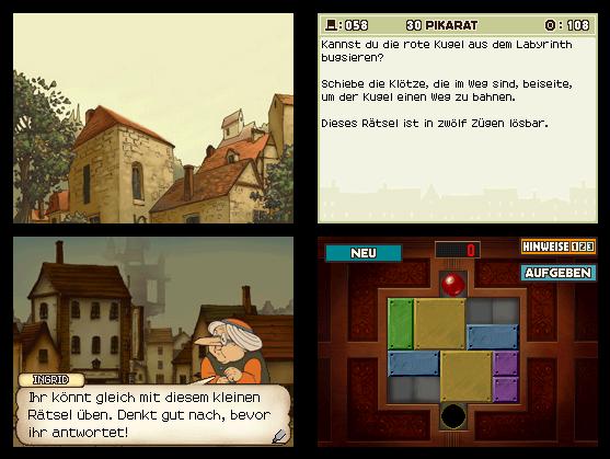 Sobald wir in gepflegter Click-&-Point-Adventure-Manier mit einer Person interagieren, setzt uns diese kurze Zeit später in der Regel darauf an, ein Rätsel zu lösen. Dieses läuft im Prinzip so ab, dass uns zu erst die Ausgangssituation in der Rätselbeschreibung erläutert wird, damit wir uns ein Bild von der Denkaufgabe machen können. Oft gilt es einfache Rechenaufgaben zu lösen, Schachfiguren auf einem Spielbrett so aufzustellen, dass sie sich gegenseitig nicht bedrohen oder aus vier verschiedenen Gebilden die richtige Version zu entziffern. Während die ersten Rätsel noch einfach sind und uns kaum Grips abverlangen, werden die Aufgaben mit der Zeit anspruchsvoller. Gegen Ende des Spiels gibt es sogar einige Kopfnüsse, wo wir unsere Köpfe wirklich anstrengen müssen, um auf eine logische Lösung zu kommen. Spieler, die ungeduldig sind und wahllos nach Lösungen suchen, werden nur milde bestraft. Für das Lösen der Rätsel erhalten wir jedes Mal eine gewisse Anzahl der so genannte Pikarat. Geben wir für ein Rätsel also eine falsche Lösung an, erhalten wir beim zweiten Versuch weniger Pikarat als üblich. Pikarat spiegeln unsere Leistungen wieder und sind für Bonus-Materialien, die wir nach dem Durchspielen erhalten, essentieller Bestandteil des Spiels.
