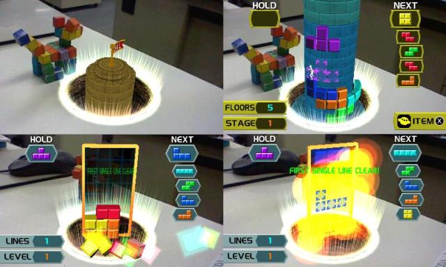 Ein weiterer Modus drängt uns dazu, den Bereich, wo wir leuchtende Sterne sehen, von der Vorder- und der Rückseite des Spielfelds zu bebauen, um diese einzusammeln. Der Sprint-Modus verkürzt den Marathon-Modus einzig und allein auf vierzig abzubauende Reihen. In Anbetracht von Konzentrationsschwierigkeiten bei dem einen oder anderen Spieler, können vierzig Reihen gegebenenfalls auch Ansporn genug sein, um Bestzeiten aufstellen zu können. Der Meister-Modus eignet sich für die wahren Tetris-Experten, denn hier fallen Tetriminos mit der maximalen Geschwindigkeit auf das Spielfeld, sprich sie sind unmittelbar am Boden zu sehen und müssen schleunigst richtig angeordnet werden – dieser Modus ist definitiv nicht für Gelegenheitsspieler geeignet und fordert auch noch jene Spieler, die sich selbst als wahre Tetris-Kenner bezeichnen. Im Augmented-Reality-Modus müssen wir die mit dem Handheld mitgelieferte Fragezeichen-Karte auf den Tisch legen, welche dann auch schon ein Loch in den Boden unseres Tisches frisst. Hier sollte tatsächlich viel Platz vorhanden sein, da sich das gerade einmal vierspurige Spielfeld gerne mal dreht. Selbiges funktioniert auch mit dem bereits erwähnten Kletterer, nur hier sehen wir das Menschlein in unserem Wohnzimmer klettern – eine nette Sache, die uns allerdings nur kurzzeitig an den Bildschirm fesseln konnte. Abschließend sei natürlich noch erwähnt, dass Tetris mit bis zu sieben Mitspielern und auch online gespielt werden kann.