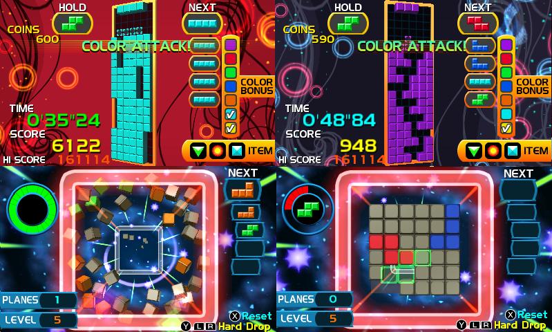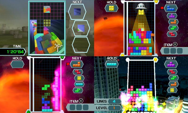Bis zu drei Gegenstände dürfen wir auf einmal in unserem Repertoire lagern, doch wir dürfen nicht aussuchen, welches Item wir als nächstes einsetzen möchten. Das ist einerseits schade, da dies weitere Taktik mit in das Spiel gebracht hätte, doch andererseits könnte der Gegner nicht so viel Glück bei den entdeckten Items haben, was die ganze Sache wieder fair wirken lässt. Mit Blockschuss dürfen wir Blöcke auf das Spielfeld des Gegners schießen, mit einem Ufo lassen wir vier Reihen unseres Blockgebildes verschwinden und mit dem Umkehren-Item verändern wir kurzzeitig die Steuerung des Gegners. Mit Kaskaden können wir den 3DS kurz nach links oder rechts kippen, um Lücken mit freien Blöcken zu füllen und mit Tauschen dürfen wir die unsere Matrix mit der unseres Gegners tauschen. Meteore können wir ebenfalls auf das Spielfeld unseres Gegenspielers hinabfallen lassen und mit Nebel behindern wir für einen kurzen Moment seine Sicht. Wird unser eigenes Sichtfeld durch den Nebel blockiert, müssen wir übrigens wie verrückt in das Mikrofon des Nintendo 3DS blasen, um ihn verschwinden zu lassen. Das ist zwar spielerisch gesehen eine nette Abwechslung, aber in hitzigen Situationen oft nervig und besonders bei einer hohen Fallgeschwindigkeit der Steine fatal. Zum Glück lassen sich die facettenreichen und teils auch innovativen Items über das Optionsmenü abschalten, dann gelten auch wieder die bekannten und vergnüglichen Tetris-Grundregeln.