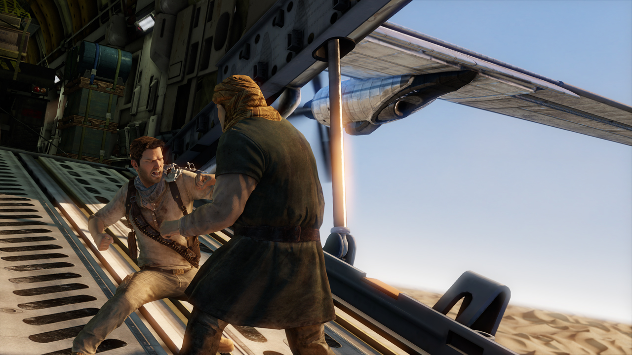 Leider sind wir nicht allein auf unserer Suche, denn dieses Mal dürfen wir uns vorrangig mit einer britischen Geheimorganisation auseinander setzten – jener, der wir bei unserem ersten Treffen mit Sullivan in die Quere gekommen sind. Auch wenn in typischer Indiana-Jones-Manier gehaltene Rätsel und Suchpassagen die Serie schon seit dem ersten Teil mitprägten, bestand bei unserem Abenteurer schon immer eine Waffenfixierung. Tausende Gegner werden von unserem plündernden Helden Abenteuer für Abenteuer in hitzigen Schusswechseln erlegt. In Uncharted 3: Drake’s Deception versucht Naughty Dog einen Schritt aus dem Ballerspektakel. Keine Angst, an Gegnern wird es uns schon nicht mangeln! Das Entwicklerteam setzt im neuesten Teil viel mehr einen größeren Wert auf den Nahkampf und gelegentliche Schleichpassagen. So haben wir die erste Spielstunde sogar komplett waffenlos erleben können. Die Nahkämpfe wurden dabei zu ausführlicheren Quick Time Events hochstilisiert – zwar trifft dies nicht jeden Geschmack, dennoch bringen sie etwas Abwechslung in die geringfügig angestaubte Uncharted-Reihe. Ferner wird es erstmalig an einigen Stellen sogar möglich sein, Gegner schleichend zu umgehen oder diese klammheimlich auszuschalten. Leider funktioniert dies nicht konsequent im ganzen Spiel, sodass wir letztlich doch meistens lieber unsere Waffe zur Hand nehmen.