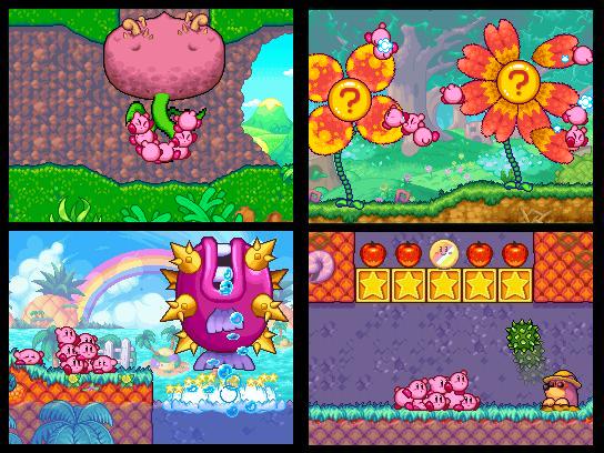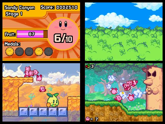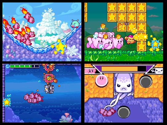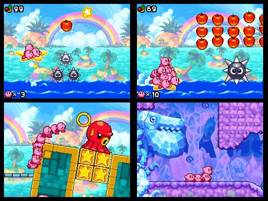 Der durchtriebene Magier Nekrodeus, seines Zeichens Anführer der Schädli-Bande, fällt ins kunterbunte Kirby-Universum ein. Dieses möchte er nur zu gerne unterjochen, doch da hat er die Rechnung nicht mit dem beliebten Edelknödel gemacht. Obwohl Nekrodeus Kirby in zehn einzelne Charaktere aufspaltet, bleibt unser wackerer Held am Ball und macht sich mit seinen anderen neun Artgenossen auf den Weg, um Nekrodeus zu vernichten. Die Handlung ist zwar serientypisch eher dünn gehalten, doch reduziert sie das Geschehen auf Nötigste, denn anders als in den restlichen Serienteilen, befehligen wir hier nämlich nicht nur Kirby, sondern gleich eine ganze Kompanie von Edelknödeln, womit auch schon beim neuartigen Gameplay wären. Beginnend mit nur einer Spielfigur, erlernen wir im ersten Level selbstverständlich zu erst die ganzen Grundbefehle. Wir lernen, wie wir Kirby auf einen Gegner hetzen und auch, wie wir herumliegendes Obst einsammeln. Wir müssen einfach nur mit dem Touchpen das Zielobjekt antippen, fertig! Was sich in der Theorie einfach liest, erweist sich in der Praxis vor allem bei der Kontrolle von mehreren Kirbys als durchaus fordernd. Nachdem die ersten Schritte hinter uns liegen, friert plötzlich der Bildschirm kurz ein und auf einmal taucht wie aus dem Nichts ein weiterer Kirby auf. So merken wir fix, dass wir für alle hundert gefutterten Früchte einen Kirby dazu bekommen.