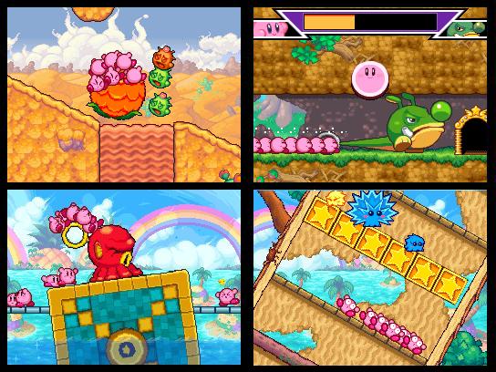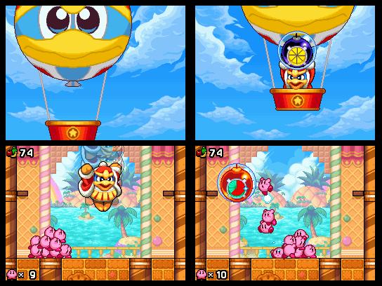 Die Medaillen sind besonders bei Mäuserich Daroach beliebt, der mit seinem Luftschiff über die vier Hauptinseln der Spielwelt kreist. Die regenbogenfarbene Medaille eines jeden Levels müssen wir für das Finale zwar zwangsweise finden, um überhaupt zur letzten Welt Zugang zu erlangen, doch sammeln wir die goldenen Trophäen ein, schalten wir somit automatisch Zusatzinhalte frei, mit denen wir vor dem eigentlichen Spielbeginn nicht gerechnet haben. Wir reden hier nicht von Jukeboxen oder ähnlichem, obwohl diese natürlich wie in vielen anderen Kirby-Titeln auch enthalten sind, sondern gleich von kompletten und teilweise auch sehr guten Minispielen, die fast nichts mit dem Spielprinzip zu tun haben. In bester Xevious-Manier befehligen wir hier etwa eine durch den Weltraum ballernde Kirby-Schlange. Eine Pinball-Variante ist ebenfalls mit unter den freischaltbaren Inhalten. Im nächsten Minispiel müssen wir unsere Reflexe testen und rollenspielmäßig gegen zahlreiche Gegner des Kirby-Universums antreten. Wie bereits erwähnt, treten wir aber natürlich auch gegen Feinde im eigentlichen Spielverlauf an. Während es schon mal ein paar Sekündchen länger dauert, einen Gegner umzuwerfen, wenn wir nur mit einem Edelknödel unterwegs sind, sind zehn Kirbys für sich genommen schon eine kleine Armee. Auch größere Gegner haben so nur selten eine Chance gegen das gut trainierte Team.