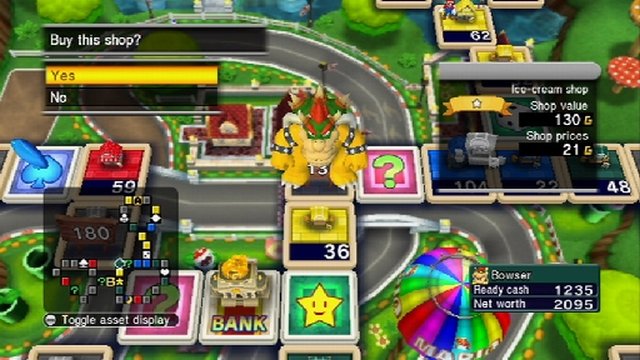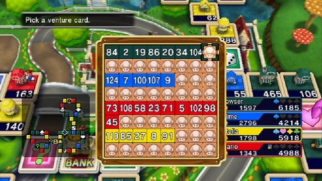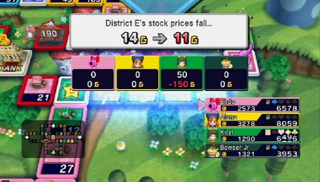 Eine Handlung hat Straßen des Glücks leider nicht, doch das macht im Grunde auch nichts, da das eigentliche Spielprinzip uns schon genug Vergnügen bereitet. Japanische Spieler kennen die Itadaki-Sutorīto-Reihe mitsamt dem Gameplay bereits seit 1991, doch im Westen konnte die Serie bisher noch nicht Fuß fassen. Da aus dem Lande der aufgehenden Sonne öfters mal die eine oder andere kuriose Spielidee, wie beispielsweise Cooking Mama, in hiesige Gefilde überschwappt, sind einige unter euch sicherlich vorsichtig, was Straßen des Glücks betrifft. Es ist aber bei weitem keine so ausgeflippte Spielidee, wie ihr euch das vielleicht vorstellt. Yuji Horiis Idee verbindet kurz gesagt das klassische und vielerorts gängige Gesellschaftsspiel Monopoly mit Aktienkursen und feindliche Geschäftsübernahmen, doch der Reihe nach. Zu Beginn des Spiels schlüpfen wir in die Haut unseres im Mii-Kanal erstellten Miis und wählen im Tour-Modus das Spielbrett, auf dem wir dann Geschäfte tilgen und unsere Mitbewerber ausstechen. Während das eigentliche Spielbrett im Vordergrund zu sehen ist, werden dahinter in weiter Ferne animierte Spielumgebungen aus dem Super-Mario- oder dem Dragon-Quest-Universum abgebildet. Da entdecken wir unter anderem das Schloss Trodain aus dem achten Teil der Rollenspielserie von Sonys PlayStation 2 oder die Piazza Delfino aus Super Mario Sunshine vom Gamecube. Der Wiedererkennungswert ist hoch, doch das Beste kommt noch.