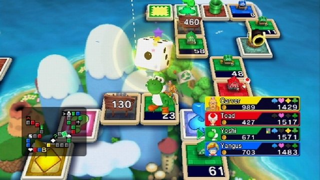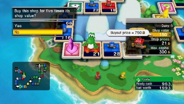 Alle Spielbretter werden mit den Melodien des jeweiligen Titels unterlegt, was bei dem einen oder anderen Videospielveteranen sicherlich ein Lächeln aufs Gesicht zaubern wird. Schöne Spielbretthintergründe bringen einem aber natürlich nichts, wenn wir nicht mit den richtigen Charakteren zusammenspielen, doch auch dafür haben die Entwickler gesorgt. So schlüpfen wir in die Rolle unseres Miis und spielen gemeinsam mit den Charakteren aus den Universen der eingangs erwähnten Videospielserien. So tauchen aus der Welt von Super Mario nicht nur der Klempner höchstpersönlich auf, sondern selbstverständlich auch sein treuer Dinosaurier Yoshi. Dragon-Quest-Fans freuen sich hingegen unter anderem über Schnitz aus dem (erst im letzten Jahr in Europa veröffentlichten) sechsten Teil der Reihe. Selbstverständlich ist das auf der ganzen Welt bekannte Schleimmonster ebenfalls mit von der Partie, für Abwechslung ist also definitiv gesorgt. Sobald wir dann einmal alle Einstellungen getroffen haben, dürfen wir auch schon ein Spielbrett aus dem Tour-Modus aussuchen. Anschließend werden die Siegesbedingungen bekannt gegeben. So ist es oft der Fall, dass wir eine gewisse Anzahl an Goldmünzen erwirtschaften oder dafür sorgen müssen, dass ein Spieler ausscheidet, wir aber das meiste Kapital besitzen müssen. Hier unterscheidet das Spiel übrigens zwischen Bargeld und dem Eigenkapital, was die ganze Sache für jüngere Spieler vielleicht erschweren könnte.