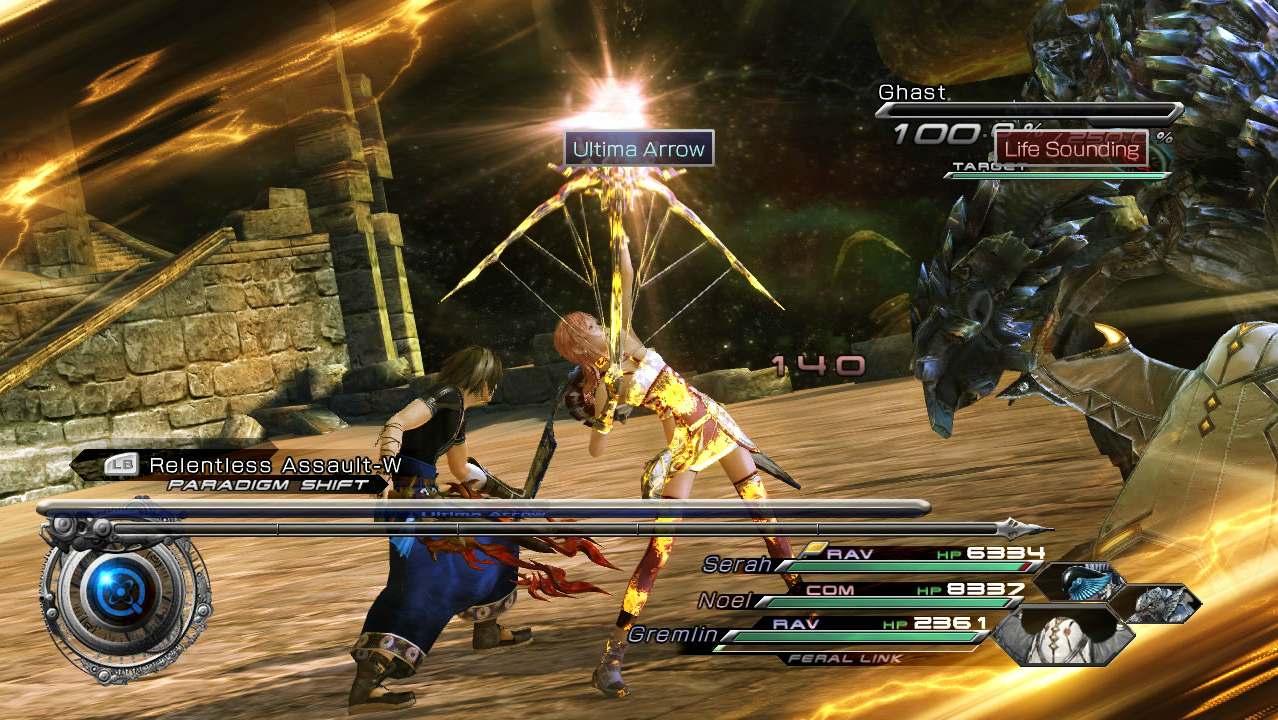 Was sich genau nach den Geschehnissen von Final Fantasy XIII abgespielt hat, können wir nicht mit Gewissheit sagen. Fest steht, dass ein Zeitreisender namens Noel in das Leben von Lightnings Schwester Serah getreten ist. Gemeinsam reisen sie in eine andere Zeitepoche der fantastischen Geschichte. In einem zeitlich anders eingeordneten Cocoon werden die beiden Freunde auch schon direkt von einem überdimensional großen Gegner angegriffen. Da liegt es nahe, dass wir sofort zu den Waffen greifen müssen und das Kampfsystem von Final Fantasy XIII-2 kennenlernen. Grundsätzlich hat sich im Nachfolger zum zwei Jahre alten Titel nur sehr wenig getan. Immer noch läuft der Kampf nach dem Active-Time-Battle-System ab. So liegt es wieder einmal an uns, geschickt durch die verschiedenen Paradigmen zu schalten und das richtige der jeweiligen Situation entsprechend auszuwählen. Neulinge werden an dieser Stelle wohl nichts verstehen, weshalb wir das System kurz zusammenfassen. Paradigmen sind verschiedene Konstellationen von Berufstypen, die unsere Charaktere beherrschen. Da fallen beispielsweise Brecher, Heiler, Verheerer oder Verteidiger drunter. Während Brecher bei den Gegnern großen Schaden verursachen, sind die Verheerer dafür zuständig, dass dieser Schaden durch einen Multiplikator immer weiter in die Höhe getrieben wird. Bevor unsere Charaktere das Zeitliche segnen, sollten wir schnell in eine Verteidigungshaltung wechseln und noch dazu die angeschlagenen Gefährten heilen.