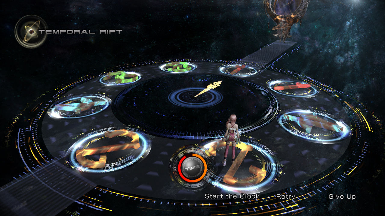 Das Schicksal dieser Welt gilt es in Final Fantasy XIII-2 abzuwenden, doch sicherlich werden bei euch jetzt die Alarmglocken klingeln. Zwar wäre der Versuch, den Sturz von Cocoon zu verhindern, über die Jahrhunderte zwar planbar, doch diese lange Zeitspanne wollen wir aber nicht warten. Da kommt es uns (und der Handlung) wie gerufen, dass plötzlich kreuz und quer über die Welt verstreut Portale auftauchen. Sobald wir bestimmte Artefakte gefunden haben, können wir diese Portale öffnen und durch die Zeit reisen. Das macht unser ganzes Abenteuer sehr viel abwechslungsreicher, als es der Vorgänger war. Zwar verläuft die wichtige Storyline wie ein roter Faden durch die verschiedenen Zeitepochen und unterschiedlichen Örtlichkeiten, doch wir stoßen gelegentlich auch auf Urartefakte, mit denen wir (meistens) optionale Portale öffnen können. So gelangen wir schon relativ früh im Spiel in den Sunleth-Auenwald, wo ein gefährlicher und gegebenenfalls für unsere Helden zu starker Kaiserpudding auf uns wartet. Sollten wir an dieser Stelle zu schwach für die Auseinandersetzung sein, verlassen wir diese Epoche einfach wieder und gelangen mit einem anderen Portal in eine andere Zeitlinie. Dieses System motiviert uns, quer durch die Zeit zu reisen und die unterschiedlichen Ereignisse zu erleben, welche die Welt von Cocoon und Grand Pulse dulden muss. Einige Spielstunden später und gut gewappnet kehren wir an den Ort des Geschehens zurück. Dieses Mal sind wir unserem Feind deutlich überlegen, doch nach dem Sieg regeneriert sich der Kaiserpudding.