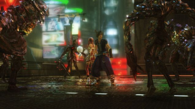 Da Feinde nicht mehr dauerhaft sichtbar sind, kehren die Zufallskämpfe in gewisser Weise in das Final-Fantasy-Universum zurück. Aus diesem Grund haben sich die Entwickler über die Kampferöffnung Gedanken gemacht. Sobald sich Feinde in der Nähe tummeln, werden diese in der näheren Umgebung unverzüglich angezeigt. Sind wir schnell genug, können wir unsere Gegner direkt attackieren und starten den Kampf mit einem Geschwindigkeitsvorteil, doch bei einer normalen Berührung beginnt die Auseinandersetzung ohne diesen Bonus. Wir können einem Kampf auch vollständig aus dem Weg gehen, wenn wir es denn schaffen, den Radius schnell genug zu verlassen. Misslingt uns dies, erhalten die Feinde einen Vorteil gegen uns. Die Kämpfe laufen grundsätzlich ähnlich wie in Final Fantasy XIII ab. Der Active-Time-Battle-Balken füllt sich mit der Zeit auf. Sobald dieser den Wert für die gewünschte Aktion erreicht hat, können wir Serah und Noel auf die Gegner losstürmen lassen. Die physischen und magischen Angriffe haben auf jeden Feind unterschiedliche Wirkungen. Hier gilt es das Verhalten des jeweiligen Monsters genauestens zu beachten (mit der Zeit füllt sich auch die Datenbank mit Schwächen und Stärken). Verwunden uns die Gegner zu sehr, haben wir selbstverständlich die Möglichkeit, uns mit Objekten und Heilzaubern wieder selbst auf die Beine zu helfen. Im Test haben wir allerdings bemerkt, dass nur Allheilmittel, Bluttränke und Phönixfedern wirklich von Nutzen sind. Für die anderen Items haben wir nur sehr selten beziehungsweise überhaupt keine Verwendung gefunden. Je nach Spielweise werden diese Gegenstände aber ihren Zweck erfüllen, denn wer die hart in den Kämpfen verdienten Kristallpunkte nicht auf die Heilerrolle verteilt und sich lieber anderen Berufen zuwendet, ist auf die nützlichen Utensilien zwangsweise angewiesen.