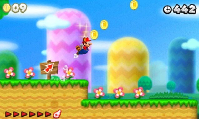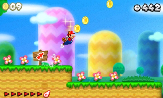Das, was wir von New Super Mario Bros. 2 wissen, könnte direkt die Handlung eines Wario-Jump-’n’-Runs sein. Wer Marios Gegenspieler nicht kennt, sollte wissen, dass dieser nichts anderes als Gold im Sinn hat. Beispielsweise erhält man je nach Spielweise in Wario Land ein anderes Haus für den Schnauzbartträger. Ob die Entwickler dieses Konzept so in New Super Mario Bros. 2 übernehmen werden, ist fraglich. Dennoch jagen wir auch in diesem Spiel den Goldmünzen hinterher, von denen es dieses Mal ein vielfaches mehr gibt. Diese große Anzahl an Goldmünzen ist für ein Super-Mario-Spiel untypisch und wir sind deswegen auch schon sehr gespannt darauf, wie Nintendo den Balance-Akt zwischen Inflation und 1up-Sammelei hinbekommen wird. Auf dem Post E3 Event in Köln hatten wir nun endlich die Gelegenheit, uns das Spiel einmal genauer anzuschauen. Wir hatten die Möglichkeit, drei Levels anspielen zu können. Das erste Level ist ein Strandgebiet, in dem wir hin und wieder vom Sand in das feuchte Nass fallen lassen müssen, um auch die letzte Münze zu entdecken. Cheep-Cheeps springen derweil fröhlich über den Bildschirm – ganz im Zeichen von Super Mario Bros. 3. Apropos Super Mario Bros. 3 – das berühmte Blatt, mit welchem dem Klempner der Schwanz eines Marderhundes wächst, kommt in New Super Mario Bros. 2 ebenfalls wieder vor.