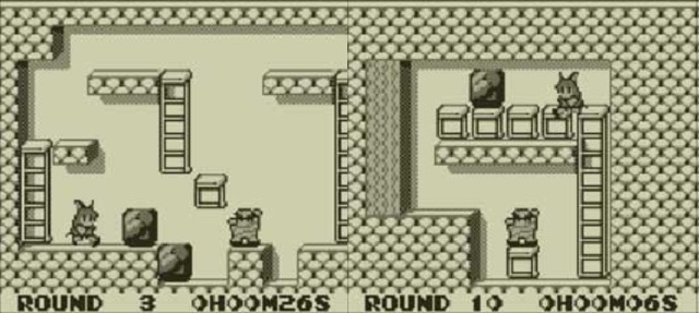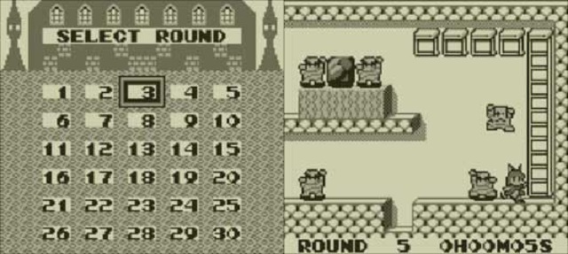 An vielen Punkten führt kein Weg daran vorbei, sich Blöcke aus dem Weg zu schaffen. An anderen Stellen sind sie dann doch fürs Vorankommen mehr als nur wichtig. Obwohl wir uns vor jedem Rätsel aussuchen dürfen, mit welchem der beiden Charaktere wir spielen möchten (Unterschiede gibt es nur bei der Hintergrundmusik), kommt es in einigen Abschnitten vor, dass wir mit Catboy und mit Catgirl agieren. Mittels Select-Taste schalten wir dann zwischen den beiden hin und her. Auf dieses fantastische Feature folgt ein wichtiger Meilenstein der Videospielgeschichte. Machen wir in anderen Spielen einen Fehler, müssen wir den Abschnitt oftmals neu beginnen. In Catrap dürfen wir das Geschehen nun genauso exakt zurückspulen, wie es stattgefunden hat – wer also bisher dachte, dass Prince of Persia: The Sands of Time diese Funktion eingeführt hat, liegt eindeutig falsch. Es hat das Feature allerdings verbessert und ansehnlicher gemacht – Catrap war hier sozusagen der Wegbereiter, den wir stundenlang spielen möchten. Wer alle Rätsel lösen möchte, wird gut fünf Spielstunden beschäftigt sein. Der Fortschritt wird leider nur mittels Passwörter festgehalten. Besitzer der Virtual-Console-Fassung aus dem eShop werden dank der internen Speicherfunktion jubeln und wer nach Beenden des Spiels immer noch Lust auf Rätsel hat, der darf sich im Editier-Modus einfach seine eigenen erstellen. Es ist dann doch immer wieder erstaunlich, was 1990 auf Nintendos GameBoy so alles möglich gewesen ist und um was sich Entwickler heute herumreden.