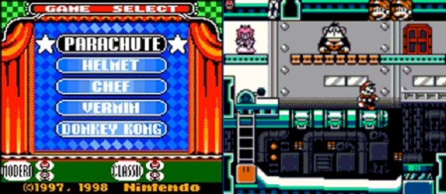 Während wir uns beim Vorgänger noch mit vier Spielen zufrieden geben müssen, ist es bei der Game & Watch Gallery 2 sogar ein Spiel mehr, welches wir jeweils im Klassik-Modus und in der modernen Variante angehen dürfen. Wer die erste Edition der Game & Watch Gallery kennt, der weiß auch, dass wir es bei der klassischen Version der Spielchen wieder einmal mit Mr. Game & Watch zutun bekommen. Dieses Mal gilt es, die versofteten Spiele Parachute, Helmet, Chef, Vermin und Donkey Kong zu meistern. In Parachute befinden wir uns mit dem schemenhaften Mr. Game & Watch in einem Boot auf dem Meer. Aus einem Hubschrauber springen der Reihe nach immer mehr Fallschirmspringer heraus, die wir einsammeln sollen. Dazu bewegen wir das Boot in Intervallen nach links oder nach rechts. Wenn wir uns mit dem Gameplay angefreundet haben, dürfen wir den Schwierigkeitsgrad erhöhen. Es kommt dann vermehrt vor, dass sich Fallschirmspringer in Palmen verheddern und erst verzögert aufs Meer hinabfallen. Nur wer hier überlegt Entscheidungen trifft, wird einen neuen Highscore aufstellen können. Spielen wir Parachute in der modernen Version, ist es Bowsers Luftschiff, welches am Himmel umherfliegt. Hilflose Toads, Yoshis und Donkey Kong Juniors hüpfen aus dem Fenster, wobei die Einfangprozedur dieselbe ist, doch hier sitzt Klempner Mario mit im Boot.