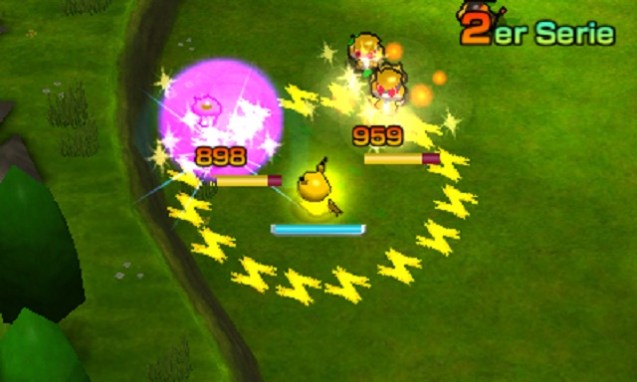 Wir müssen hier einfach wie verrückt auf die A-Taste hämmern, damit unsere Truppe schnell und stark auf die gegnerische Gruppe trifft und diese aus dem Bildschirm pfeffert. Dem einen oder anderen Spieler mag das Gameplay auch außerhalb der Frontalkämpfe etwas zu monoton wirken. Mehr als auf die A- und B-Taste drücken ist meistens nicht erforderlich, um im Spiel erfolgreich zu sein. Je nach Gegneranzahl müssen wir zwar auch einmal ausweichen, doch das kommt – wenn überhaupt – erst im letzten Drittel des Spiels vor. Abwechslung bietet da schon eher der Zweispielermodus, den wir aufgrund eines nicht vorhandenen Online-Modus und mangels fehlender lokaler Super-Pokémon-Rumble-Spieler leider noch nicht testen konnten. Dadurch soll es aber laut Spielanleitung möglich sein, noch schneller an die begehrten Wesen zu kommen und die Sammlung von über sechshundert Pokémon zu vervollständigen. Optisch befindet sich der Titel auf einem gesunden Mittelmaß. Hintergründe wirken (der Hardware entsprechend) plastisch, doch Objekte sind alle im Cel-Shading-Look gehalten. In Bewegung sehen die Spielzeuge so zwar putzig aus, wirken in der Welt aber etwas deplatziert. Die Musik des Spiels hätte auch etwas abwechslungsreicher sein können. Die schönen Kampfmelodien sind abwechslungsreich, doch die eigentliche Hintergrundmusik ist es kaum. Sie kommt uns auf Dauer zu oft vor. Auf Dauer können wir euch Super Pokémon Rumble jedoch empfehlen, denn wer seinen 3DS unterwegs jederzeit mit sich führt, kommt in den Genuss eines schnellen und im späteren Drittel auch fordernden, wenn gelegentlich auch monoton wirkenden Spiels.