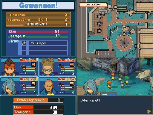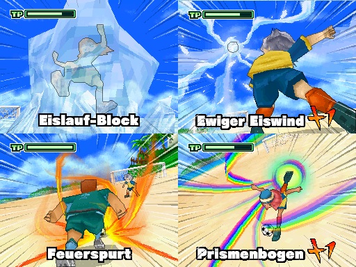 Diese kurzen Matches, die wir auch regelrecht in Zufallskämpfen erleben, wenn wir durch die Städte und Außenbezirke laufen, dauern tatsächlich nur wenige Sekunden an, zumal hier auch nur vier Spieler auf dem Platz stehen. Entweder müssen wir das Runde ins Eckige schießen, dem Gegner den Ball abnehmen, eine bestimmte Zeit lang selbst kein Tor riskieren oder dem Gegner das Leder verwehren. Erst wenn die Handlung es von uns verlangt, gegen eine andere Mannschaft zu spielen, stehen dann auch tatsächlich elf Spieler auf einer Seite des Felds. So lange wie ein richtiges Fußballspiel ist ein Match in Inazuma Eleven 2 aber nicht. Auch hier reduziert man die Zeit auf das Vierfache der maximalen Dauer eines Zufallskampfes – in unseren Augen absolut angemessen. Je besser beziehungsweise je schöner wir spielen und desto mehr Tore wir schießen, desto mehr Erfahrungspunkte bekommen wir für ein Match. So steigen unsere Spieler neue Levels auf, verbessern ihre Attribute wie Schusskraft, Ausdauer oder Körpereinsatz und erlernen hin und wieder auch neue Spezialtechniken. Genau in diesem Punkt unterscheidet sich Inazuma Eleven 2 von so gut wie allen Fußballspielen der Welt. Wie beispielsweise im Anime Kickers, werden alle Techniken überzeichnet dargestellt. Da fliegt dann auch schon mal ein Fußball mit dem Schweif eines Drachen oder mit Flammen ins Tor.