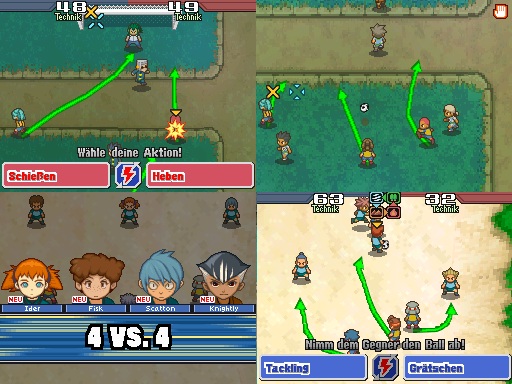 Bei Feindkontakt und Torschüssen laufen im Hintergrund also Berechnungen ab, die sich auf die Attribute der Spieler stützen und sich auf die Elemente der Fußballer beziehen. Genau wie im Vorgänger und ähnlich wie bei Pokémon ist Erde effektiv gegenüber Feuer, Feuer besser als Holz, Holz hält Wind statt und Wind wiederum ist effektiv gegen Erde. Wer dieses System beherrscht, hat auf dem Fußballfeld leichteres Spiel, denn die Gegner fühlen sich im zweiten Teil deutlich herausfordernder an als noch im Vorgänger. Besonders im Mittelteil des Spiels ist das ein Grund, weiterhin der fantasievollen Handlung zu folgen, doch je länger wir spielen, desto eher fällt uns auf, dass die künstliche Intelligenz der eigenen Spieler zu wünschen übrig lässt. Inazuma Eleven 2 verlangt von uns vermehrt Gruppentechniken in die Tat umzusetzen und diese lassen sich nur durch geschickte Pässe verwirklichen, doch einige Spieler verfolgen das Spielgeschehen nicht immer so, wie wir uns das vorstellen. Daher empfehlen wir euch an dieser Stelle, das Geschehen kurz einzufrieren, damit ihr den Spielern einzelne Anweisungen geben könnt. Wir hätten uns gefreut, wenn Level-5 ein wenig mehr Sorgfalt in Bezug auf den Action-Anteil des Spiels gesetzt hätte. Trotzdem machen die Matches jederzeit sehr viel Spaß und durch unterschiedliche Spielerkonstellationen spielen sie sich zudem abwechslungsreich.