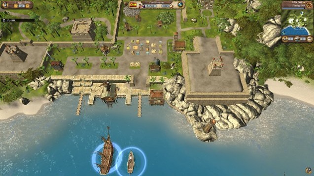 Unmittelbar nach dem Start des Spiels dürfen wir uns gleich zwischen zwei Kampagnen entscheiden. In der Händler-Kampagne soll das Spiel mit möglichst friedlichen Mitteln zum Abschluss gebracht werden, in der Abenteuer-Kampagne werden Konflikte meist mit Hilfe von Säbeln und Kanonen gelöst. Die erzählte Geschichte bleibt dabei aber die gleiche, genauso wie die erkundbare Welt. In beiden Kampagnen folgt zunächst ein ausführliches Tutorial in Text- und Videoform. Man wird dabei aber trotzdem erst seine Zeit brauchen, um sich in alle Bedienungen und Mechanismen des Spiels einzuarbeiten. Das sollte in einem Strategiespiel mit entsprechender Tiefe unserer Meinung nach aber auch gegeben sein. Falls es noch offene Fragen gibt, können wir jederzeit nützliche Tipps und weitere Hilfen aus unserem Logbuch abrufen. Das karibische Meer und der Golf von Mexiko sind von Anfang an sichtbar und können schon vollständig von uns befahren werden. Aufgedeckt werden nur noch Städte, die durch kleine Symbole dargestellt werden. Von dieser übersichtlichen Oberweltkarte gelangen wir durch einen Knopfdruck in die einzelnen Häfen. Dann sieht man alle Einrichtungen und Produktionsbetriebe im Stile der Anno-Reihe, in der man den Bürgern bei ihrem regen Treiben beobachten kann.