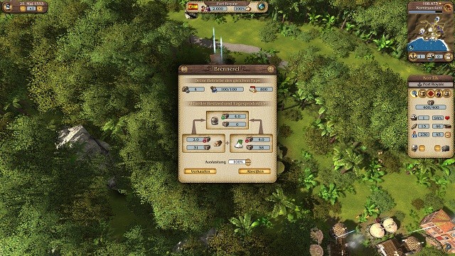 Der Vergleiche zu der Spieleserie Anno ist aber nur in gewissen Maßen gerechtfertigt. Ist es in Anno noch unabdingbar beim Bau von Häusern auf die Platzierung und die Entfernung zu anderen Gebäuden zu achten, ist das bei Port Royale 3 völlig irrelevant. Der Schwerpunkt liegt auch nicht auf der Befriedigung der Bedürfnisse von ansässigen Bürgern, sondern viel mehr beim Aufrechterhalten der Wirtschaft durch logistisch und politisch geschicktes Handeln. Verschifft werden in Port Royale 3 unter anderem grundlegende Nahrungsmittel wie wie Weizen und Bananen, sowie Baumaterialien, Metalle und Holz. Von den über zwanzig Ressourcen sind natürlich manche seltener als andere. Fleisch ist auf hoher See beispielsweise immer eine Mangelware. Wo man in Anno sehr früh einfach eine Rinderfarm errichtet, müssen Luxusgüter hier teuer importiert werden. Zu den allseits bekannten Gütern gesellen sich mit Farbmitteln und Tauen auch eher unkonventionelle Objekte in unser Lagerhaus. Für Kämpfe müssen verschiedene Munitionsarten ebenso an Bord geschafft werden wie Säbel und Musketen. Insgesamt sind aber alle Waren sehr realitätsbezogen, denn Seide und teuren Schmuck brauchen die spartanisch lebenden Siedler auf den karibischen Inseln nicht.