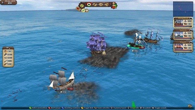 In einem Spiel, dass in der Karibik des 16. bis 17. Jahrhunderts spielt, dürfen Piraten natürlich nicht fehlen. Für wehrlose Handelsschiffe entwickeln sie sich im Laufe der Zeit zu einer ernstzunehmenden Plage. Daher ist es sinnvoll, früh Schiffsverbände, sogenannte Konvois, zu gründen. Das Aufrüsten dieser mit größeren Schiffen ist unerlässlich, um Güter sicher ans Ziel zu transportieren. Kaufkriterien sind die Kapazität der Laderäume, die Anzahl der Kanonen und natürlich der Preis. Eine Barke für wenig Geld sollte man nicht der Militärfregatte mit dutzenden Kanonen vorziehen. Wenn Kampfhandlungen einmal unvermeidlich sind, darf man den Kampf überspringen und den Ausgang berechnen lassen – oder wir stürzen und selbst ins Getümmel. Dabei übernehmen wir die direkte Kontrolle über eines der Schiffe, während wir bis zu maximal zwei weiteren Geleitschiffen bestimmte Verhaltensweisen zuordnen. Insgesamt bieten die Schlachten eine angenehme taktische Tiefe und wir können sogar Schiffe entern, um unsere Flotten auszubauen. Vergessen darf man nicht die eigene Anzahl von Kanonen und Matrosen, die unsere Geschwindigkeit, Feuerkraft und Nachtladezeiten bestimmen. Die Belagerungen von Piratenverstecken oder Häfen feindlicher Nationen gestalten sich dagegen wesentlich simpler. Die Landscharmützel gewinnt derjenige, der am meisten Soldaten mit den besten Waffen besitzt. Seltsamerweise dürfen wir nur zuschauen, wie sich die Truppen in eine Staubwolke verhüllen und hoffen, dass der Gegner das Scharmützel verliert.