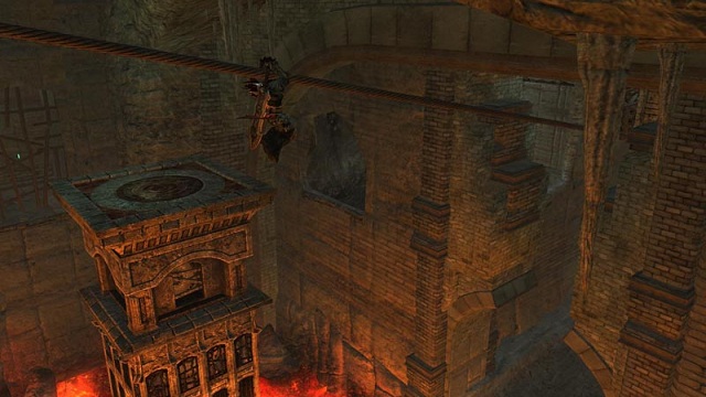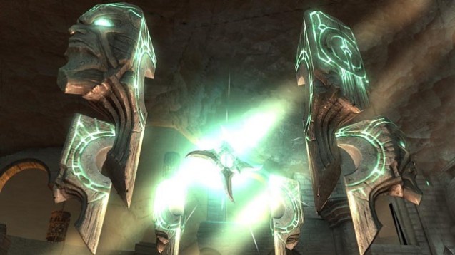 Nicht nur das dürfte The-Legend-of-Zelda-Spielern bekannt vorkommen, denn um eben jene beschriebenen Orte erreichen zu können, müssen wir die in den Dungeons gefundenen Items einsetzen. Da gibt es zum Beispiel einen Enterhaken, um an markierten Stellen von der einen Plattform auf die andere schwingen zu können oder einen Klingenbumerang, mit denen wir erst eine Feuerstelle anvisieren und dann auf eine Bombe zielen. Bei Berührung explodiert die Bombe und zerbröckelt im Anschluss in der Regel eine Mauer und legt so einen Durchgang zu einem Geheimnis frei. Diese Spielerei taucht dementsprechend nicht nur auf der Oberwelt, sondern auch in den einzelnen Dungeons auf. Kaum haben wir einen Raum eines Dungeons betreten, gilt es auch schon ein Rätsel zu lösen. Manchmal müssen wir da einfach nur ein von einer Engelstatue gehaltenes Schwert zu einer Statue tragen, die kein Schwert in Händen hält oder einen Block von einem Podest schubsen, um diesen an eine Stelle im Raum zu schieben, von wo aus wir eine neue Anhöhe erreichen können. Die Mechaniken haben wir als Fans des Hylianers bereits vor Jahrzehnten verinnerlicht und sie funktionieren in Darksiders ebenso gut. In den Dungeons lauert am Ende selbstverständlich auch ein Bossgegner, den wir bekämpfen müssen, um die Handlung vorantreiben zu können.