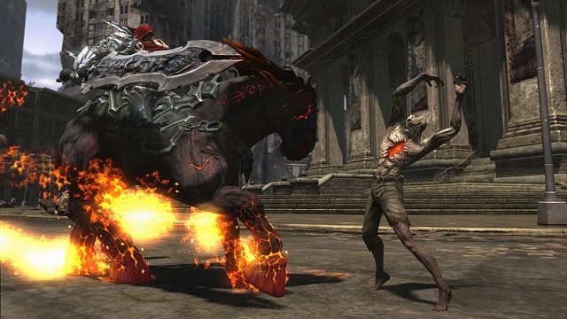 An jenem Morgen hätte sich wohl niemand vorstellen können, dass er den Abend nicht mehr erleben wird. Jener Tag begann wie jeder andere, doch ein plötzlicher Meteoritenregen hat das Leben der Menschheit schlagartig von einem Moment auf den anderen verändert. Der Vorfall ist nämlich nichts anderes, als die in der Bibel prophezeite Apokalypse. Wenig später lassen sich auch schon die ersten Engel und Dämonen auf der Erde blicken, die gegeneinander Krieg führen. Krieg ist das zentrale Element von Darksiders, doch nicht, weil dieser Bestandteil der Handlung ist, sondern dass wir ihn verkörpern. Mit dem apokalyptischen Reiter Krieg müssen wir uns zunächst einen Weg durch die Stadt suchen, welche uns entfernt an New York City erinnert. Überall explodiert etwas, um Hilfe schreiende Menschen laufen durch die Straßen und biblische Gestalten tauchen aus dem Boden und dem Himmel auf. Selten wird ein Spiel pompöser eingeleitet. Leider hat aber auch die Apokalypse einen Haken, denn diese sollte zu jenem Zeitpunkt noch gar nicht eingeleitet werden. Schnell wird ein Sündenbock gesucht und die Auswahl fällt ausgerechnet auf uns. Einhundert Jahre nach der Apokalypse bekommen wir endlich unsere Chance, Rechenschaft vor dem Rat abzulegen, um unseren Ruf reinzuwaschen. Zu allem Übel wird ihm auch noch ein dämonischer Beobachter an die Seite gestellt.
