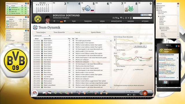 Die wohl wichtigste und auch interessanteste Neuerung im Fußball Manager 13 ist die Team-Dynamik. Diese hilft dem Manager dabei, die Interessen und Wünsche der Spieler zu erkennen und zu berücksichtigen. Dies ist natürlich, wie auch in der Realität, nicht immer möglich. Es gibt eventuell viele Spieler die gerne Kapitän sein oder einen Elfmeter schießen möchten. Außerdem wird die Beziehung der Spieler zueinander angezeigt. Es handelt sich dabei zum Beispiel um Positionskämpfe, Freundschaften, Rivalitäten oder Verwandtschaften. Ebenfalls wird eine Team-Hierarchie angezeigt, die deutlich macht, welche Spieler als Führungsspieler geeignet sind und welche nur Mitläufer sind. Eine Bewertung des Co-Trainers über die Zusammenstellung der Mannschaft bietet nochmals eine Hilfestellung. Natürlich ist es auch im neuen Ableger der Reihe weiterhin möglich, Einzelgespräche mit den Spielern zu führen, wobei die Auswahl an Gesprächsthemen leider weiterhin sehr gering ist und wir daher manchmal einfach nicht wissen, was wir dem Spieler mitteilen sollen. Zudem hat jeder Fußballer auch persönliche Ziele, auf die man nach Möglichkeit eingehen sollte, da sonst die Moral sinken kann. Eine weitere wichtige Neuerung ist die Kaderplanung, mit deren Hilfe man zu verpflichtende Spieler sozusagen schon einmal in die Mannschaft einbauen kann. So können wir anschließend sehen, wie sich die Verpflichtung des Spielers auf die Mannschaftsstärke auswirkt.