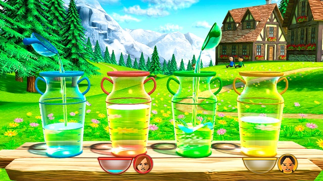Ein weiterer Vorteil ist, dass es auf der Wii U bisher kaum (herausragende) Party-Spiele gibt. Somit eignet sich die vorliegende Minispielsammlung besonders gut, um mit Freunden, Bekannten, der Familie oder Kommilitonen gemeinsam die Zeit zu verbringen. Dabei kommt grundsätzlich niemals Langeweile auf, da die enthaltenen Minispiele allesamt unterschiedlich sind und verschiedene Schwerpunkte setzen. So dürfen wir eine vorgegebene Pose abgleichen oder auf herumschwirrende Raumschiffe schießen. In einem anderen Minispiel heißt es, mit einem Einrad über einen schmalen Grad zu fahren und das Gleichgewicht nicht zu verlieren. Beim Vorgänger gab es neben den Minispielen noch die so genannten Zimmerspiele. Diese kehren in ähnlicher Form bei Wii Party U zurück. Die Hausparty-Spiele beziehen unsere Umgebung mit ein – diesmal jedoch in abgeschwächter Form. Beispielweise legen wir hier das Wii U GamePad, auf dessen Screen ein fließender Fluss zu sehen ist, auf dem Boden. Bewaffnet mit der Wii-Fernbedienung müssen wir dann so tun, als ob wir mit einer Kelle Wasser aus dem Fluss schöpfen, um es dann zum Fernseher zu transportieren und in einen Krug zu gießen. Passend zur Musik des Theme A von Tetris tanzen wir wie ein paar Irre um das GamePad wortwörtlich herum oder mimen ein Verkaufsrollenspiel in der Burger-Bude.