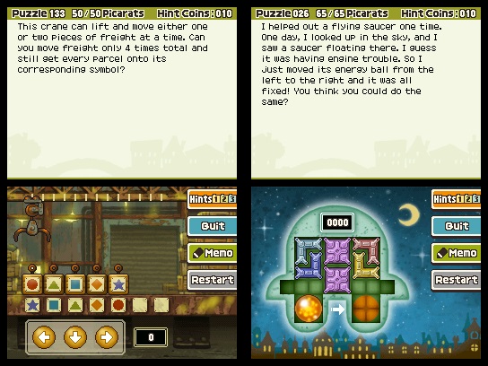 Am eigentlichen Spielverlauf hat sich derweil nicht viel verändert. Nach wie vor klicken wir uns in bester Point-and-Click-Adventure-Manier durch die Spielwelt, tippen mit dem Stylus unseres Nintendo DS alles an, was nicht bei drei auf den Bäumen ist und dringen immer tiefer in das Stadtleben von Misthallery ein. Wir unterhalten uns mit sehr illustren Charakteren, wie einem Jungen der zum Teil in lautmalerischer Vogelsprache spricht, einer älteren Dame, die ihre Süßigkeiten partout nicht an Emmy verkaufen möchte oder einem stocktauben Herrn, mit dem sich unsere Truppe nicht richtig verständigen kann. Jede Person hat übrigens dasselbe Problem und wer das Professor-Layton-Universum kennt, der weiß, dass während des Dialogs nicht selten Rätsel angesprochen werden. Manchmal fragen wir uns zwar, warum es nach drei Spielen die Entwickler immer noch nicht schaffen, die Rätseleinlagen besser und subtiler ins Spiel zu integrieren, doch sobald die bekannte Rätselmelodie ertönt, interessiert uns die Frage ohnehin nicht mehr. Hinter den Rätseln verstecken sich knifflige Mathematikaufgaben, einige Knobel- und Denkaufgaben, sowie Logikrätsel, die manchmal auch in Form von Schalter- und Blockschieberätseln auftreten. Die Rätsel sind vielfältig, doch die Aufgabenstellungen in einigen Fällen nicht aussagekräftig genug, was dann und wann zum puren Raten führt.