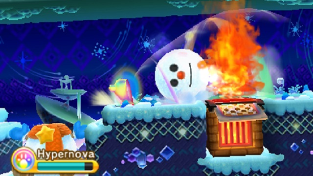 Kirby Triple Deluxe spielt sich weitgehend wie die Vorgänger. Mit Kirby durchsausen wir also die (eigentlich) zweidimensionalen Spielabschnitte, saugen dabei massenweise Gegner auf, kopieren ihre Spezialfähigkeiten und richten diese schlussendlich wieder gegen Kirbys Feinde. Haben wir durchs Runterschlucken eine Fähigkeit kopiert, attackiert Kirby danach beispielsweise mit einem Schirm, einem Schwert oder einem Bogen. Ihr habt richtig gelesen, denn auch wenn die meisten Spezialfähigkeiten bereits aus dem Franchise bekannt sein dürften, haben sich die Entwickler Gedanken gemacht und das Repertoire sinnvoll erweitert. Der Angriff mit dem Bogen ist nur eine Neuerung. Dazu gesellt sich noch eine Glocke, mit der wir den Gegner die Ohren abschlagen. Eine viel wichtigere Neuerung bei den Techniken ist jedoch die Meganova. In einigen Levels taucht (meist gegen Ende) eine Frucht auf, die wir nur berühren brauchen. Kirby erhält anschließend versteckte Kräfte, die es ihm ermöglicht, nicht nur mehrere Gegner gleichzeitig, sondern auch gigantische Objekte einzusaugen. Das macht das Spiel an diesen Stellen zwar unwesentlich leichter, aber die Entwickler spielen an diesen Stellen mit vielen Ideen. Beispielsweise das Einsaugen von Gegnern durch ein ganzes Röhrensystem oder das Miteinsaugen der Lebensenergieanzeige eines Bossgegners. Nett!