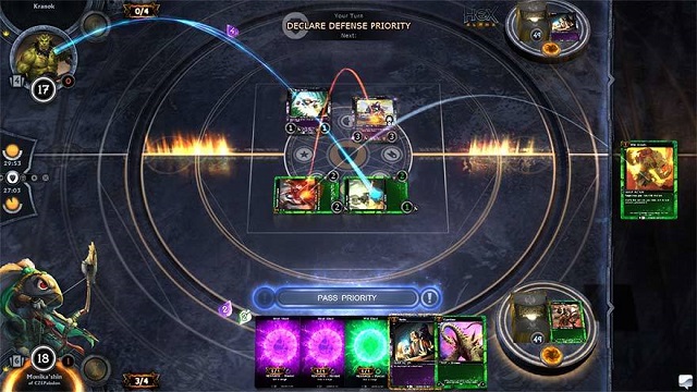 Magic: The Gathering ist auch direkt das Stichwort, mit welchem man Hex: Shards of Fate am besten umschreiben kann. Während unseres Gamescom-Termins weist man uns direkt in das Spielsystem ein. Dieses sei nämlich nicht einfach gestrickt, sondern recht komplex. Das bemerken wir auch schon in den ersten Minuten, in denen wir uns in das Spiel erst einmal einfinden müssen. Haben wir jedoch die verschiedenen Phasen mitsamt ihren Buttons dann jedoch durchschaut, geht alles ganz schnell und als alte Magic-Veteranen haben wir keine Probleme, uns mit dem Spiel anzufreunden. Wer Magic: The Gathering jedoch noch kein einziges Mal gespielt hat, muss nicht verzagen. Direkt zu Spielbeginn erhält man eine leichte Einführung in das Spielsystem. Das heißt, dass wir zunächst sieben Karten von unserem Deck, welches hier sechzig Karten umfasst, ziehen. Gefallen uns die Karten, können wir direkt mit dem ersten Zug beginnen. Andernfalls dürfen wir noch einmal ziehen, dann jedoch jeweils eine Karte weniger als zuvor. Ein gutes Blatt sieht so aus, dass wir genügend Ressourcen und andere Karten auf der Hand haben, die wir schnell ausspielen können. Jede Runde dürfen wir eine Ressourcenkarte ausspielen, mit denen wir dann schlussendlich unsere restlichen Karten bezahlen. Das funktioniert in Hex: Shards of Fate jedoch anders als beim großen Vorbild.