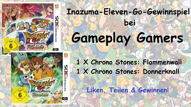 Am dritten Juli 2015 hat Gameplay Gamers bereits den fünften Geburtstag gefeiert. Aus diesem Anlass verlosen in diesem Jahr in freundlicher Zusammenarbeit mit Nintendo einmal das Spiel Inazuma Eleven Go – Chrono Stones: Flammenwall und einmal das Spiel Inazuma Eleven Go – Chrono Stones: Donnerknall, jeweils für den Nintendo 3DS. Um an unserem Gewinnspiel teilzunehmen, habt ihr mehrere Möglichkeiten, die ihr gerne miteinander kombinieren dürft. Für jede Teilnahme erhaltet ihr Lose; je mehr Lose man besitzt, desto höher sind am Ende die Gewinnchancen. Wie folgt könnt ihr am Gewinnspiel teilnehmen: