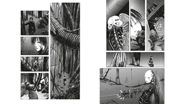 Blame! kommt durchweg mit sehr wenigen Dialogen und Textboxen aus und lässt die längste Zeit reine Bilder für sich sprechen. Dies ist teils extrem wirkungsvoll, bedeutet aber auch, dass die Handlung und der Fortschritt der Geschichte nicht immer im Mittelpunkt stehen. Es gibt auch keine Einführung, keine langwierigen Erklärungen und damit aber auch keine Bevormundung des Lesers, der sich inmitten der Welt erst nach einigen Kapiteln zurechtfinden wird. Interessanterweise gibt es auch keinen Klappentext oder rückseitige Storyabrisse – jeder Leser beginnt den ersten Band auf Seite 1 mit idealerweise demselben Informationsgehalt. Handlungsorte und Figuren wechseln gerne ohne Vorwarnung von Kapitel zu Kapitel. Diese etwas diffuse und indirekte Art des Storytellings wird nicht jedem gefallen, macht aber hier den Reiz von Blame! aus. Wir werden als Leser nicht vom Autor sanft in die Story eingeführt, sondern direkt in das wirre Tunnelnetz von Blame! hineingestoßen. Nach über vierhundert Seiten am Ende des Bandes angelangt, sind eine Menge Fragen unbeantwortet und auch Killy bleibt noch recht uneinsichtig – zusammen mit den tollen Zeichnungen der Grund, sich auf die Fortsetzung zu freuen!