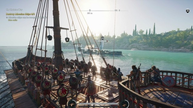 Als ansässiger Söldner ist der Spieler sozusagen die erste Anlaufstelle für Probleme aller Art. Mit kleineren Aufträgen wird der Spieler an die Spielsysteme herangeführt und die verhältnismäßig kleine Insel sorgt dafür, dass er sich zunächst nicht verlaufen kann. Das Griechenland in Odyssey ist von vielen Hügeln und Klippen geprägt, woran das klassische Bewegungssystem der Assassin’s-Creed-Reihe immer noch zur Geltung kommt. Per Knopfdruck hangelt und schwingt sich die Spielfigur mühelos an tödlichen Situationen vorbei, was immer noch sehr beeindruckend aussieht. Sehr schnell gewinnt allerdings das eigene Pferd an Bedeutung, mit dem große Strecken nicht nur in Windeseile zurückgelegt werden, sondern auch noch automatisch dem Straßenverlauf gefolgt werden kann – besonders praktisch für sehr weite Strecken! Die versprengten Inseln werden per Schiff erreicht, dessen Pflege und Mannschaftsaufbau an Assassin’s Creed IV: Black Flag und Assassin’s Creed: Rogue erinnert. Im Gegensatz zum vierten Teil können die Seekämpfe und Schifffahrtspassagen zum größten Teil auch ignoriert werden, falls sie einem nicht gefallen. Zu empfehlen ist das aber nicht: Über die glänzenden Wellen zu reiten und neue Ziele am Horizont auszumachen, beflügeln noch einmal das Abenteuergefühl des Spiels.