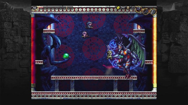 Gespielt wird dabei übrigens nicht aus der Vogelperspektive, sondern aus der zweidimensionalen Seitenansicht. Das System, um im Spiel erfolgreich zu sein, erinnert zudem ein wenig an Nintendos Metroid-Reihe. Nur mit bestimmter Ausrüstung ist es möglich, Türen zu öffnen, um so in neue Bereiche zu gelangen. La-Mulana lässt uns da aber wesentlich mehr Freiheiten, denn es gibt so viele Geheimnisse und auch Wege, um ans Ziel zu gelangen, dass wir uns zu Beginn von den Möglichkeiten erschlagen fühlen, auch wenn uns der zweite Teil etwas mehr an die Hand nimmt. Uns gefällt diese Freiheit jedoch sehr, da sie den Wiederspielwert drastisch erhöht. Die gesamte Spielwelt ist wirklich detailreich und atmosphärisch aufgebaut. So erfahren wir von Dorfbewohnern und verschollenen Steintafeln Hintergründe über die Sagenwelt von La-Mulana, wobei ein Großteil der Atmosphäre jedoch Grafik und Soundtrack ausmachen. So erinnern uns die Grafiken des Spiels an die gute, alte Super-Nintendo-Zeit und der Soundtrack von seiner Qualität stark an Castlevania: Rondo of Blood vom TurboGrafx-16. Die Ohrwürmer des Soundtracks lassen uns in unseren Gedanken nicht mehr los. Das schafft nicht jedes Spiel! Da ist es leider sehr schade, dass das Bild in 4:3 wiedergegeben wird. Aufgrund des Gebietaufbaus ist das vielleicht nicht anders möglich, aber bei einem Remake wünschenswert gewesen. La-Mulana 2 geht immerhin ein wenig mehr ins 16:9-Format.