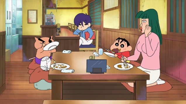 Wer die Anime-Serie Crayon Shin-chan nicht kennt, der sollte wissen, dass es sich bei dem titelgebenden Nohara Shinnosuke um einen kleinen Jungen handelt, der nichts als Unfug im Kopf hat. Entsprechend humorvoll ist eine jede Geschichte, die das Franchise erzählt. Wie in der Anime-Serie ist der Humor auch in Shin-chan: Crash! regelrecht überdreht. Das fängt abseits der absurden Handlung schon beim Frühstückstisch an. Während sich sein Vater Hiroshi über das am Abend anstehende Nomikai auslässt, schießt Shinnosuke mit seiner Action-Figur ein Geschoss auf seine jüngere Schwester Himawari. Diese erleidet daraufhin einen Heulkrampf, der von der überforderten Mutter Misae gelindert werden muss. Im ganzen Tohuwabohu spritzt auch noch Kaffee auf Hiroshis Hemd und Shinnosukes Bus zur Vorschule wartet schon vor der Tür. Diesen verpasst der Bengel natürlich. Hinzu kommt, dass er sich von der hübschen Ōhara Nanako, seiner großen Liebe, ablenken lässt. Der 28. Kinofilm reiht im Minutentakt eine abstruse Situation an die andere. Deshalb ist er auch nicht im Geringsten langatmig. Ständig passiert etwas Lustiges oder Neues. Selbst neue Charaktere werden zum richtigen Zeitpunkt eingeführt. Damit Shinnosuke die Welt retten kann, kritzelt er sich mit dem Zauberstift drei ulkige Gefährten hinzu, die unterschiedlicher nicht sein könnten.