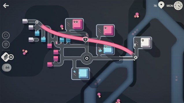 Während die ersten Spielminuten pro Karte noch recht simpel ausfallen, da wir Straßen auch getrennt voneinander anlegen können, wird es spätestens nach 15 bis 20 Minuten schon ein wenig komplizierter. Beim Spielen vergeht Zeit und sobald eine In-Game-Woche vergangen ist, erhalten wir ein paar zusätzliche Straßen und noch dazu einen kleinen Bonus. Bei diesem kann es sich um Brücken, Tunnel oder Autobahnen handeln. Dadurch können wir in Mini Motorways wertvolle Abkürzungen erschließen. Um den Verkehr zu regeln gibt es als Boni darüber hinaus auch Ampeln für Kreuzungen oder Kreisverkehre für deren Ersatz. Letzteres klingt jedoch besser als es klingt. Da die Gebäude auf der Karte zufällig aufpoppen, kann es vor allem bei fortgeschrittenen Städten nahezu unmöglich sein, einen Kreisverkehr nachträglich einzurichten. Im Notfall empfiehlt es sich also immer, die Zeit auf Knopfdruck anzuhalten und notwendige Umstrukturierungen vorzunehmen. Sobald der Verkehr an nur einer Stelle zusammenbricht, sprich dass nicht alle Städter rechtzeitig zu ihrem Zielort gelangen, endet das Spiel. Relativ schnell schalten wir neue Karten frei, die an Städte wie Moskau oder Peking angelehnt sind. Allerdings spielen sich diese bis auf die Verteilung von Flüssen und Bergketten sehr ähnlich. Mit ansteigender Spielzeit fehlt es dem Titel leider an Abwechslung.