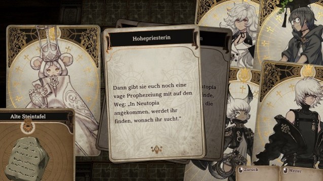 Grundsätzlich ist das alles sehr atmosphärisch und wer noch keinen Serienteil gespielt hat, wird sich sofort in den fantasievollen Grafikstil verlieben. Habt ihr aber bereits die beiden Vorgänger gespielt, kommen euch so gut wie alle Charakter- und Monsterkarten bekannt vor. Hier hat Entwicklerstudio Alim tatsächlich am falschen Ende gespart. So wirkt es fast so, als wären alle drei Spiele auf einmal entwickelt und nur zeitversetzt veröffentlicht worden. Das tut der guten Spielbarkeit aber keinen Abbruch. Bis auf die immer noch genauso verschachtelte Menüführung können wir Voice of Cards: The Beast of Burden per Maus und gelegentlich per Bewegungs- und Pfeiltasten auf der Tastatur hervorragend spielen. Per Controller funktioniert der Titel weniger gut. Es ist schade, dass gerade an diesen beiden Kritikpunkten nicht gefeilt wurde. Auch bei der je nach Spielsituation entspannenden oder adrenalingeladenen Musik hat sich nicht viel getan. So klingt das Spiel sehr wie die Vorgänger, was auch daran liegt, dass auch hier einzelne Stücke in die Recyclingtonne geworfen wurden. Positiv fällt im Gegensatz zum Vorgänger die Erzählerin auf. Im Englischen gelingt es Carin Gilfry ein Großteil der Situationen charmant mit ihrer Stimme zu unterlegen. Ishikawa Yui, die Anime-Fans als japanische Stimme von Mikasa Ackermann aus Attack on Titan kennen, macht diesen Job sogar noch besser. Fünfzehn bis zwanzig Stunden lang werden unsere Ohren super verwöhnt.