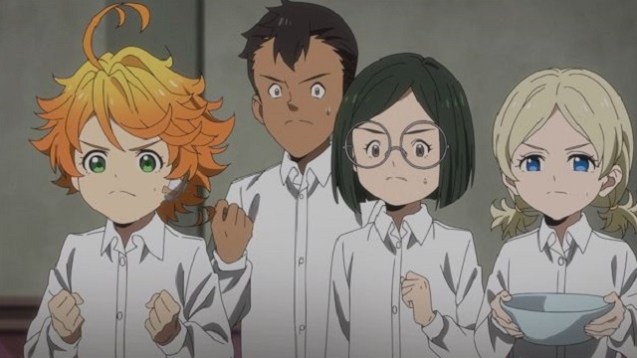 Aus der anfänglichen Idylle des Waisenhauses, in der jedes Kind vergnügt sein kann, entwickelt sich ein Alptraum. The promised Neverland ist kein Anime für schwache Nerven, spielt er doch sehr mit der Angst von Kindern, gefressen zu werden. Tag ein, Tag aus müssen die Kinder im Waisenhaus lernen und möglichst hohe Punktzahlen erreichen. Auch sportliche Betätigung steht auf dem Plan. Offenbar benötigen die Monster Kinder, die sowohl körperlich als auch psychisch fit sind. Ohne ins Detail zu gehen, erfahren sowohl der Zuschauer als auch die kleinen Protagonisten mehr und mehr über das Waisenhaus. Über die Welt außerhalb des mit einer großen Mauer umzogenen Grundstücks erfährt der Zuschauer hingegen wenig, weshalb jeder Informationshappen sofort positiv aufgesaugt wird. Handlungstechnisch ist dies sogar plausibel erklärt, denn auch die älteren Figuren wie die überdrehte Schwester Krone können den Kindern, vermutlich wahrheitsgemäß, nicht viel über das Leben außerhalb des Waisenhauses erzählen. Dem Zuschauer macht es Spaß, die Lügen von Mama Isabella zu durchschauen und schlussendlich die Wahrheit herauszufinden. Spannung wird jedoch vor allem durch den eigentlichen Handlungsstrang aufgebaut, denn Emma und Norman wollen selbstverständlich nicht das Hauptgericht von überdimensional großen Monstern werden!
