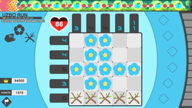 Im Gegensatz zur Hauptreihe beschränkt sich Picross X: Picbits vs Uzboross auf kleine Gitternetzrätsel, die fünf mal fünf Kästchen groß sind. Sowohl am oberen als auch am linken Rand des Nonogramms befinden sich Ziffern, die angeben, wie viele der quadratischen Felder von uns ausgefüllt werden müssen. Stehen mehrere Ziffern hintereinander, dann heißt das, dass dazwischen mindestens ein Feld freigelassen werden muss. Stehen die Zahlen Eins und Zwei hintereinander, so müssen wir ausrechnen respektive abzählen, welche der Felder wir ausfüllen und welche wir zunächst freilassen müssen. Unterschiede zur gewohnten Picross-Reihe sind darin zu sehen, dass Picross X: Picbits vs Uzboross deutlich mehr Spielmodi für uns bereithält, die viel Abwechslung ins Geschehen bringen. Zum Beispiel können die Ziffern am Rand verschwimmen oder von Pfotenabdrücken überdeckt werden, was das Lösen des Rätsels unter Zeitdruck erschwert. Auch weitere Besonderheiten wie das vordergründige Lösen einer einzelnen Reihe oder das Ziehen einer Schlangenlinie im Gitternetz können verlangt werden. Hinzu kommen weitere Ziele wie das Öffnen einer Truhe oder das Entschärfen einer Bombe, was das vollständige Lösen von zwei Reihen erfordert. Das heißt, dass wir in solchen Fällen nicht zu füllende Felder mit einem Kreuzchen zwangsweise markieren sollen. Klasse!