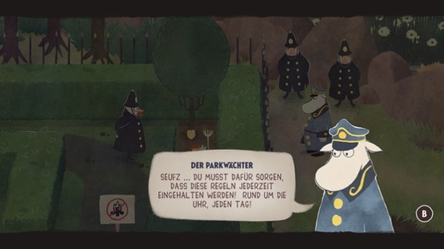 Zu Beginn von Schnupferich – Die Melodie des Mumintals sind wir nur mit einer Mundharmonika ausgestattet. Im Verlauf des Spiels kommen noch eine Flöte und eine Trommel hinzu, die wir in kurzen Intervallen auch einsetzen müssen. Beispielsweise spielen wir so lange auf der Mundharmonika, bis ein sich um uns kreisender Vogel in die richtige Richtung schaut, um eine Spinne zu verjagen. Mit der Flöte müssen wir hingegen einen weniger wachsamen Polizisten schläfrig machen. Die Trommel verwenden wir wiederum dazu, um Stalaktiten auf den Boden krachen zu lassen, um uns so einen Weg durch eine Höhle zu bahnen. Sonderlich anspruchsvoll ist all das nicht, zumal uns das Spiel symbolisch darauf hinweist, welches Musikinstrument wir einsetzen müssen. Anhand des dargestellten Symbols wissen wir auch, welcher Inspirationslevel notwendig ist. Inspiration erhalten wir, wenn wir mit Schnupferich Büsche durchsuchen, Rätsel lösen und Aufgaben bewältigen. Obwohl das Spiel im ersten Viertel noch recht linear ausfällt, öffnet sich die Welt mit dem Besuch am ikonischen Muminhaus ein wenig. Ab diesem Zeitpunkt werden uns nur noch Grenzen durch unseren Inspirationslevel, das Vorhandensein eines Musikinstruments oder benötigter Schlüsselgegenstände gesetzt. Dieser Umstand wird durch die geringe Größe der Spielwelt aber relativiert, zumal uns Schnupferich – Die Melodie des Mumintals regelmäßig in lineare Spielabschnitte schmeißt.