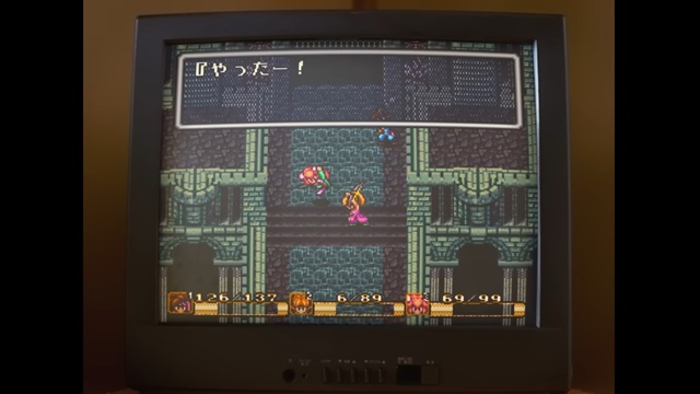 Seiken Densetsu 2, außerhalb Japans besser bekannt als Secret of Mana, verfrachtete das Geschehen des Action-Rollenspiels vom kleinen Game-Boy-Bildschirm auf die Mattscheibe. Es bietet zudem die Möglichkeit, mit bis zu zwei Mitspielern in die Welt einzutauchen. Möglicherweise erzeugt der Trailer gerade deshalb diese Atmosphäre, indem er mehrere Kinder vor dem Fernseher sitzend zeigt, die gespannt den Titelbildschirm betrachten, der zunächst mit für die damalige Zeit verhältnismäßig qualitativ hochwertigem Walgesang eingeleitet wird. Dies ist ein Faktor, der bei heutigen Action-Rollenspielen oft außer Acht gelassen wird: Das Geschehen auf dem Bildschirm ist meist nur auf einen Spieler ausgelegt. Videospiele, die alle Akteure auf einem Bildschirmausschnitt unterbringen, sind selten. Das Höchste der Gefühle sind Splitscreen- oder Online-Modi, die aber nicht das nostalgische Gefühl der Vergangenheit bewahren. Eine steile These, die in Jahrzehnten überholt sein wird, wie jedem bewusst sein dürfte. „Es fühlte sich an, als ob wir alles schaffen können, wenn wir als Team arbeiten“, heißt es im Trailer. Auch dies passt zur Kernaussage von Secret of Mana, denn selbst wenn jemand den Titel völlig alleine spielt, so sind alle drei Helden gleich relevant, um das Abenteuer zu überstehen. Ein überstandener Bosskampf mit Siegesposen schließt das Kapitel ab.