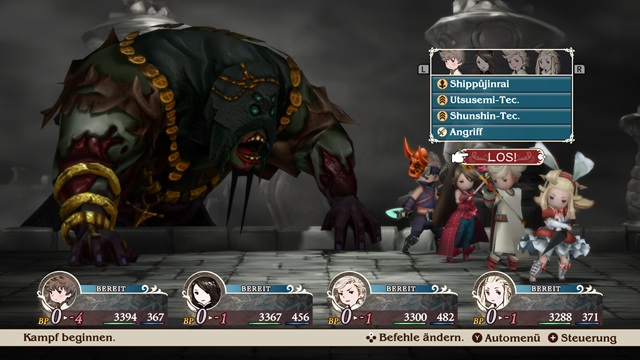 Besagte Jobs erinnern uns stark an den Super-Nintendo-Klassiker Final Fantasy V aus dem Jahr 1992. Sobald wir bestimmte Bossgegner besiegt haben, nehmen wir diesen ihre edelsteinförmigen Asterisken ab, die Zugriff auf neue Berufe geben, welche Agnès, Edea, Tiz und Ringabel ausüben können. Steigern wir in Bravely Default die Stufe eines erlernten Jobs, erhalten wir Zugriff auf eine neue Fähigkeit oder Attributsverbesserungen. So verbessern wir beispielsweise unsere Fähigkeiten im waffenlosen Kampf, der hilfreichen Weißmagie oder der destruktiven Schwarzmagie. Ein ausgewogenes Verhältnis in der Gruppe kann zudem hilfreich sein, um die Schwächen etwaiger Gegner gekonnt auszunutzen. Da kommt es uns nur gelegen, dass wir ausgewählte erlernte Fähigkeiten in bereits ausgeübten Jobs in unseren aktiven Beruf übertragen können. So dürfen auch mächtige Krieger im Notfall kleinere Wunden heilen oder Schwarzmagier auf die Abenteuerfähigkeiten des Freiberuflers setzen. Die Möglichkeiten sind denkbar groß, wobei es mit genügend Durchhaltevermögen beim Leveln und ein wenig Überlegung sogar Kombinationen gibt, welche die Spielmechanik derart heftig aushebeln, sodass selbst die stärksten Bossgegner am Ende keinerlei Bedrohungen mehr sind. Eine Korrektur des Schwierigkeitsgrades von Bravely Default hätte dem Spiel gut getan.