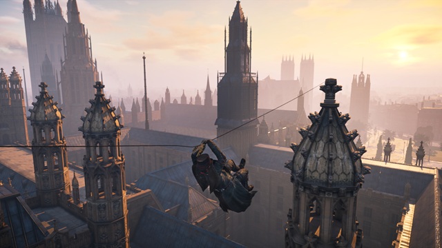 Endlich muss ich nicht mehr mühselig die Häuserfassaden erstürmen. Stattdessen kann ich im Spiel einen Seilwerfer verwenden, mit dem ich in zwei bis drei Sekunden zwischen fünf und sechs Stockwerke im Nu erklimmen kann. Ebenfalls muss ich nicht etliche Kilometer zu Fuß durch die Londoner Innenstadt laufen – ich kann ganz im Stile von Grand Theft Auto eine Kutsche stibitzen und durch die Straßen düsen und sogar driften! Fortbewegung ist das A und O in Assassin’s Creed: Syndicate. So spare ich wertvolle Lebenszeit, in der ich mich nicht über das Spiel, seine ideenlose Story oder seine stumpfen Figuren aufregen muss. Gerade was die einzelnen Missionen im Spiel angeht, könnte ich im Sekundentakt ausrasten. Da lerne ich schon spannende historische Figuren wie zum Beispiel den Naturforscher Charles Robert Darwin, die Schriftsteller Charles John Huffam Dickens und Arthur Ignatius Conan Doyle und nicht zuletzt ihre Majestät, Königin Victoria, kennen, und dann inszenieren die Entwickler von Ubisoft Québec das alles so einfallslos. The Queen is not amused! Da liegt doch so viel Potenzial auf der Straße und die Entwickler heben nicht einmal ein Staubkorn davon auf. Ich kann schon gut verstehen, warum das den Leuten keinen Spaß macht. Tut es mir ja auch nicht, aber das Gameplay ist immerhin besser als noch in Assassin’s Creed: Unity. Das hat mich sogar dazu verleitet, mir im Sale den Season Pass zuzulegen, um noch mehr zu meucheln.