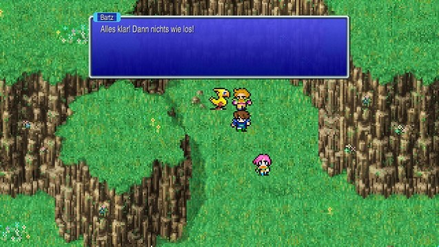 Außerdem sei an dieser Stelle erwähnt, dass sich die Spielwelt mehrfach verändert. Diese bleibt beim Erkunden dennoch vertraut. Auch eine fünfte Spielfigur, die etwa in der Mitte des auf etwa dreißig Stunden ausgelegten Abenteuers zur Gruppe stößt, passt in dieses Konzept. Nichtsdestotrotz verläuft die eigentliche Geschichte linear. Verschiedene Nebenaufgaben wie das Sammeln von Beschwörungsformeln oder Liedern motivieren darüber hinaus, auch die hintersten Winkel der Spielwelt zu erforschen. Der einzige Wermutstropfen dürfte für den einen oder anderen Spielertyp jedoch sein, dass nur die Inhalte des Originals enthalten sind. Zusätzliche Jobs und Dungeons aus späteren Versionen entfallen beim Pixel Remaster von Final Fantasy V. In den vorherigen Pixel Remasters ist das nicht anders. Unserer Meinung nach ist das aber auch nicht sonderlich schlimm, denn auch ohne den zusätzlichen Content bietet das Rollenspiel sehr viele Inhalte. Vor allem wer jeden Beruf mit jedem Charakter aufs Maximum bringen möchte und auch die beiden optionalen Superbosse ins digitale Nirwana schicken will, kann weit mehr als nur dreißig Stunden in das Spiel investieren. Da kommt es wie gerufen, dass sich das Spiel wie schon seine vier Pixel-Remaster-Vorgänger bis auf ein paar, teilweise vernachlässigbare, Kleinigkeiten problemlos bedienen und auch steuern lässt.