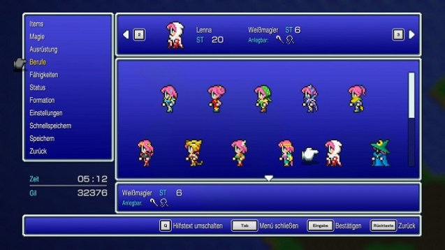 Final Fantasy V orientiert sich jedoch nicht nur am vierten Serienteil. Auch die dritte Episode der Reihe hatte einen besonderen Einfluss aufs Spiel. So kehrt das Klassensystem zurück. Jeder Charakter kann jeden Beruf im Spiel erlernen und mit Ausnahme in Gesprächen und Kämpfen wechseln. Neben Erfahrungspunkten und Gil, der Währung von Final Fantasy V, erhalten unsere vier Helden auch Berufspunkte und steigen somit nicht nur im eigentlichen Charakterlevel, sondern auch in der Stufe des Jobs auf. Im Gegensatz zu Final Fantasy III tangiert die Klasse nicht nur die Grundfähigkeiten und die anlegbare Ausrüstung. Auch die verschiedenen Fähigkeiten unterscheiden sich stark, die durch Stufenaufstiege beim Job erlernt werden. Dazu gehören sowohl passive Fähigkeiten wie das Führen einer gewissen Waffenart als auch Befehle, die im Kampfsystem kommandoartig ausgeführt werden. Das Beste dabei ist, dass wirklich jede auf diese Art und Weise erlernte Fähigkeit auch mit einer anderen Klasse genutzt werden kann. Wer sich im Genre auskennt, wird sofort erkennen, dass dieses System einen sehr großen Einfluss auf das Rollenspiel Bravely Default aus dem Jahr 2012 hatte. Im Gegensatz zu Bravely Default entstehen auf diese Art und Weise jedoch keine übermächtigen Charaktere, da stets nur eine Fähigkeit gewählt werden kann.